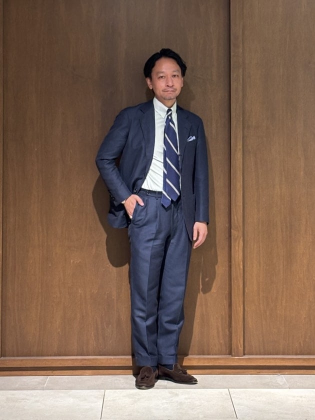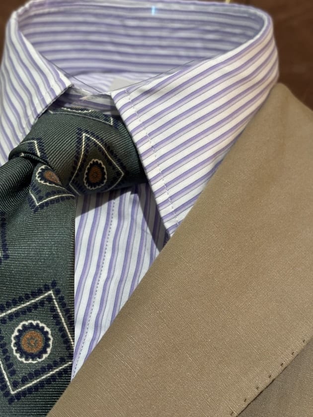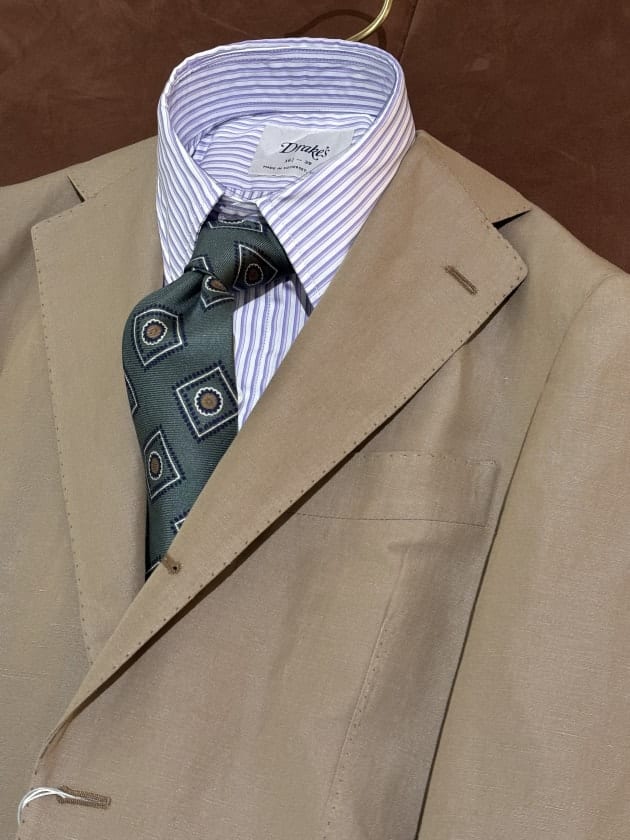 <Drake's>のシャツに、プリントタイのコンビネーション。タイドアップの場合もVゾーンは軽めに合わせたいですね。ニットタイなんかも相性は良いですね。タイドアップではなく、ポロシャツでドレスダウンもオススメです。ご参考まで。