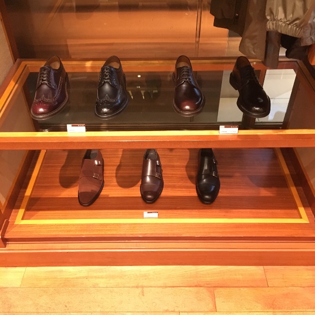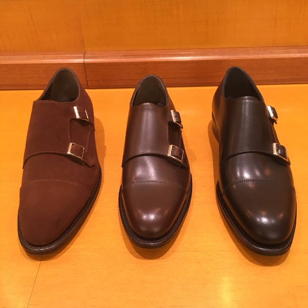 シューズはブラックのダブルモンク。少し遊びを入れるイメージ。もちろん、セミブローグやシングルモンクなどもおすすめです。