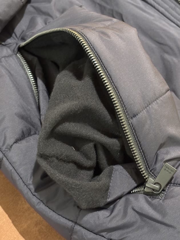 比較的シンプルなフーデッドのダウンジャケット型です。別注仕様として中綿をダウンフェザーからポリエステル中綿に変更しています。