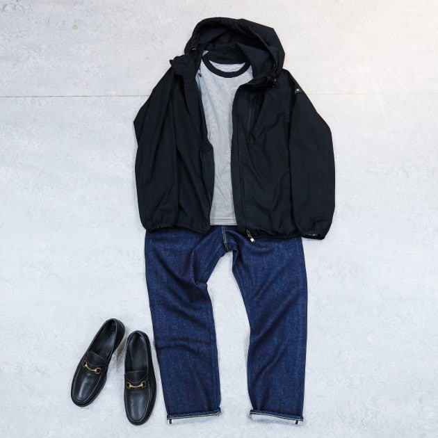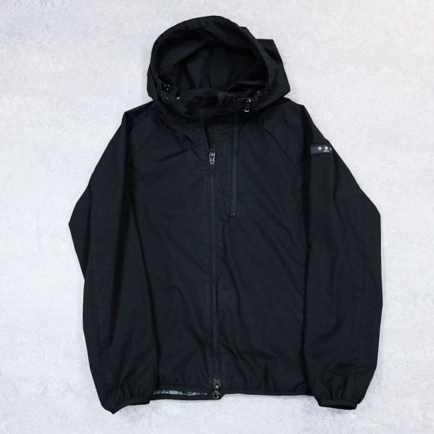 左袖にワンポイントでブランドタグ。軽量のマットナイロン生地も別注です。