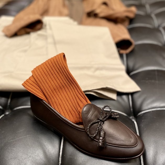 シューズは〈Baudoin & Lange〉のベルジャンシューズ。エレガントな華奢靴は今回のようなコーディネートにもピッタリです。表革にやや大振りなリボンタッセルというのもポイントで、シンプルなコーディネートに対して良いアクセントになります。