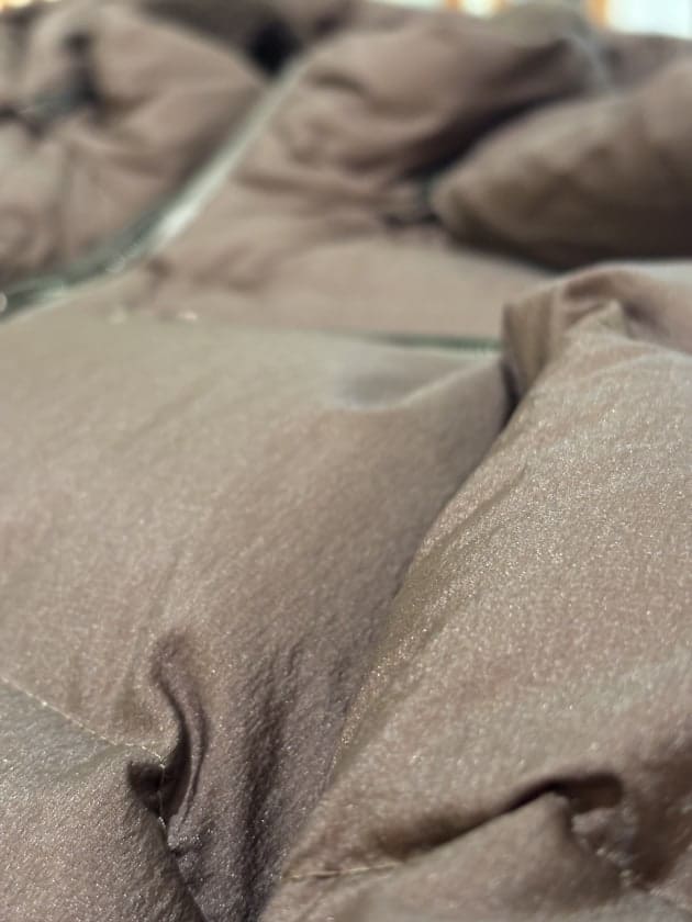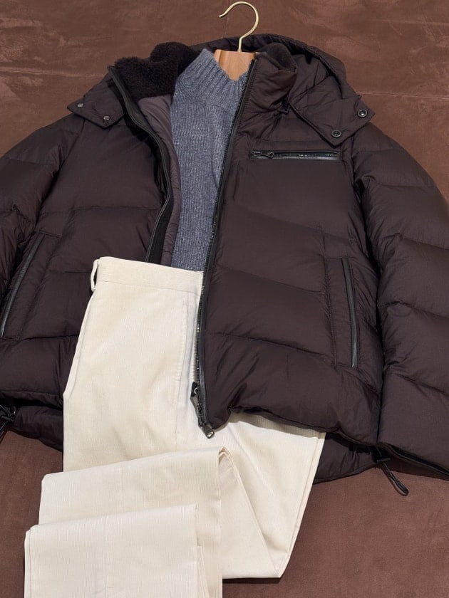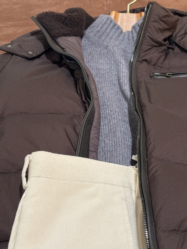ホワイト〜オフホワイト系でクリーンな雰囲気も良いですが、ジャケットがやや明るめのブラウンなので、コントラストがつき過ぎないベージュを合わせるとマイルドでリラックスした雰囲気に仕上がります。
