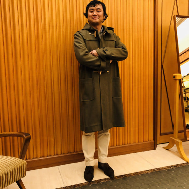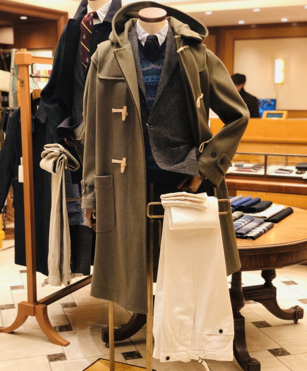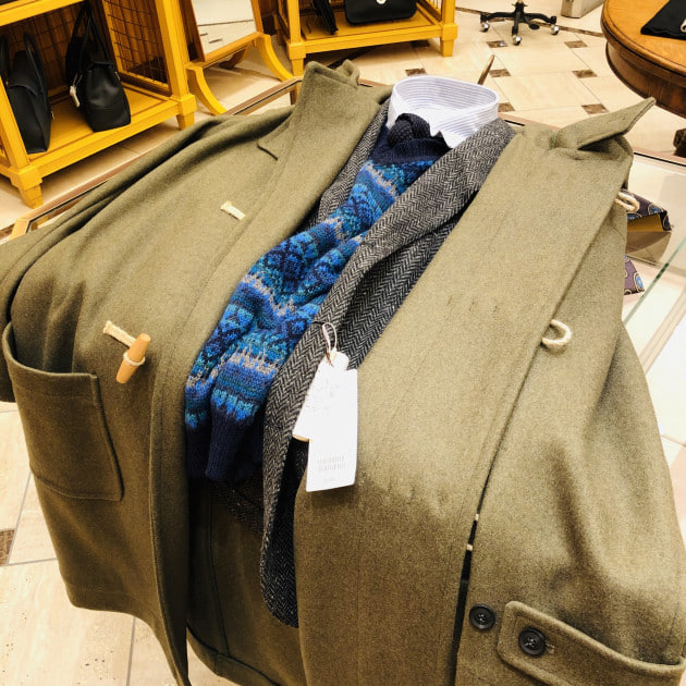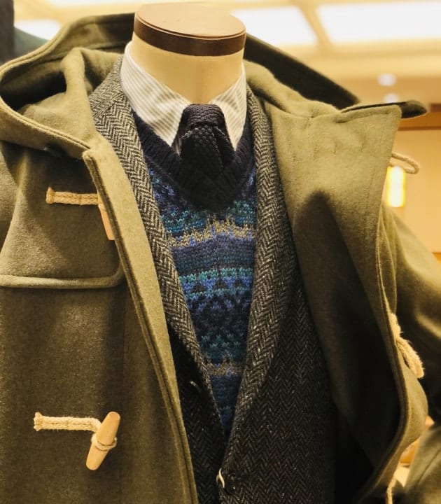 ダッフルコートを合わせた、洒落たジャケットスタイル。ヘリンボーン、フェアアイルなど、カントリーなテイストのアイテムに、ネイビーを合わせることで、土臭くなりすぎず、まとめています。オフホワイトのパンツも効いていますね!