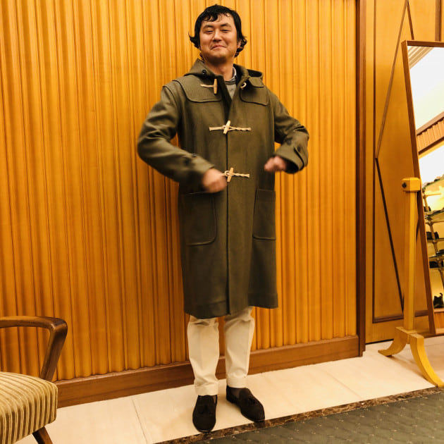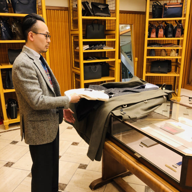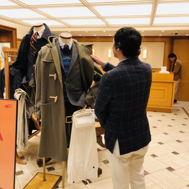 と、そこへ見慣れない洒落たお方がさっそくコートをチェック中。