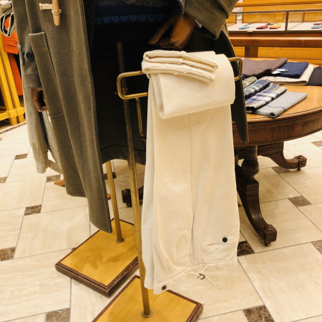 パンツはオフホワイトのコットンパンツでクリーンな印象に。ベージュを合わせて、より土臭い感じにしても良さそうです。