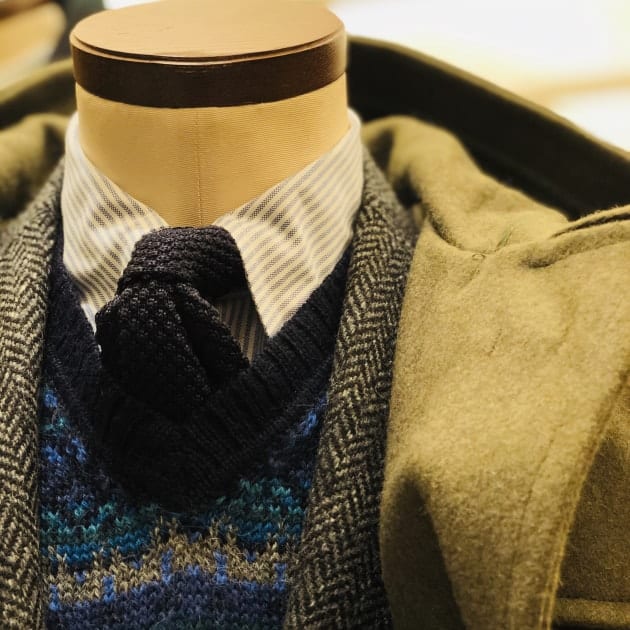 グレーヘリンボーンのジャケットにキャンディストライプのボタンダウンシャツ、ネイビーのニットタイのVゾーン。そしてネイビーベースのフェアアイルニットをレイヤード。