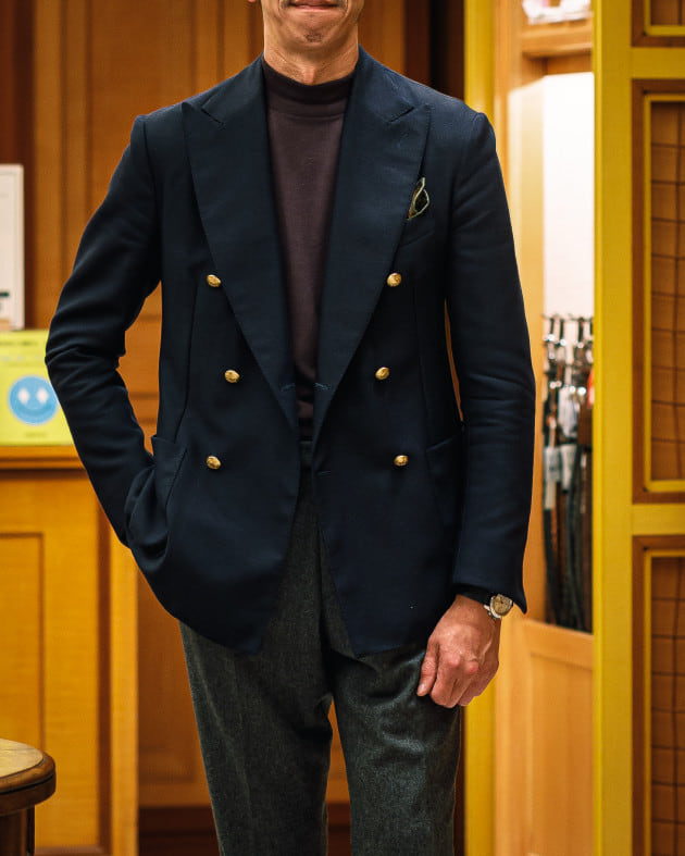 ゴージラインが高く傾斜も緩やかで、鋭いラペルの雰囲気が特徴的です。