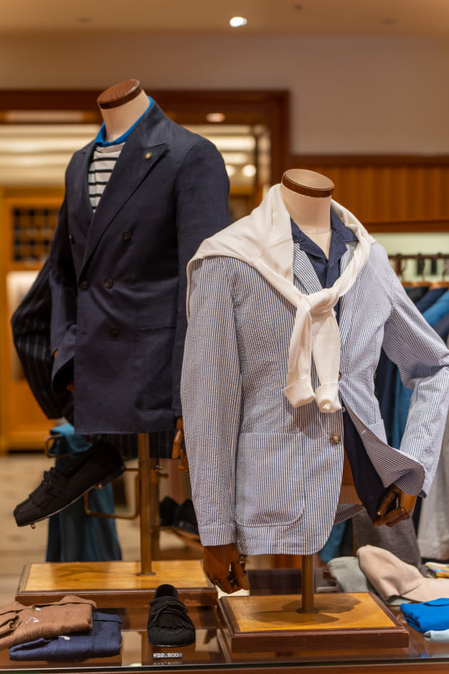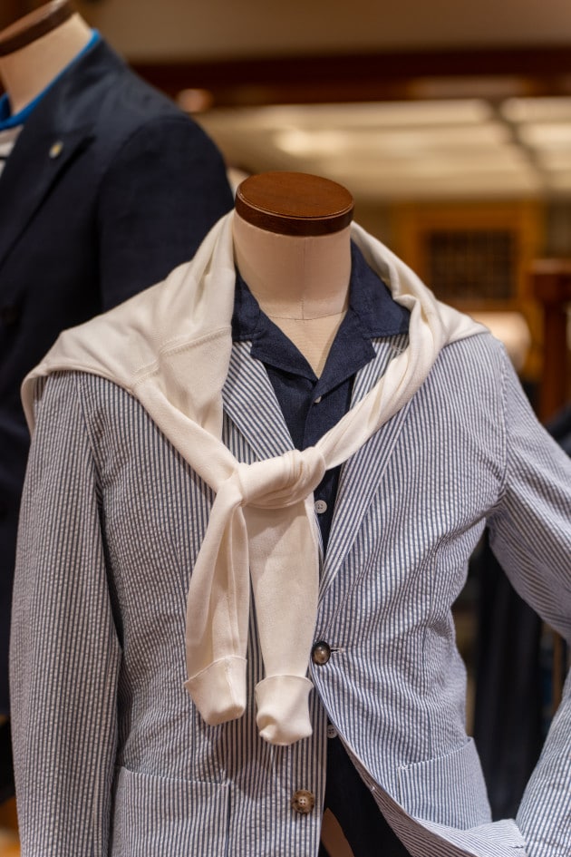 清涼感溢れるホワイトベースに、太めのストライプが力強く走ったシアサッカージャケットは、大人の色気を感じさせてくれます。