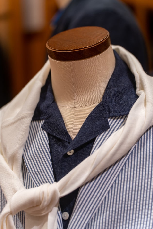よく見ないとわからないぐらいの織り柄ですが、シアサッカーの凹凸の生地感との相性も抜群。カッタウェイ型の襟もノータイスタイルにちょうど良いです。