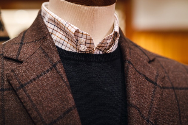 素直にストライプタイで英国的な合わせも良いですが、チェックのタブカラーシャツはノータイでニットを重ねたカジュアルな着こなしもおすすめ。着こなしのアクセントに是非。