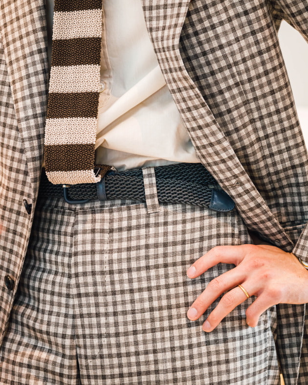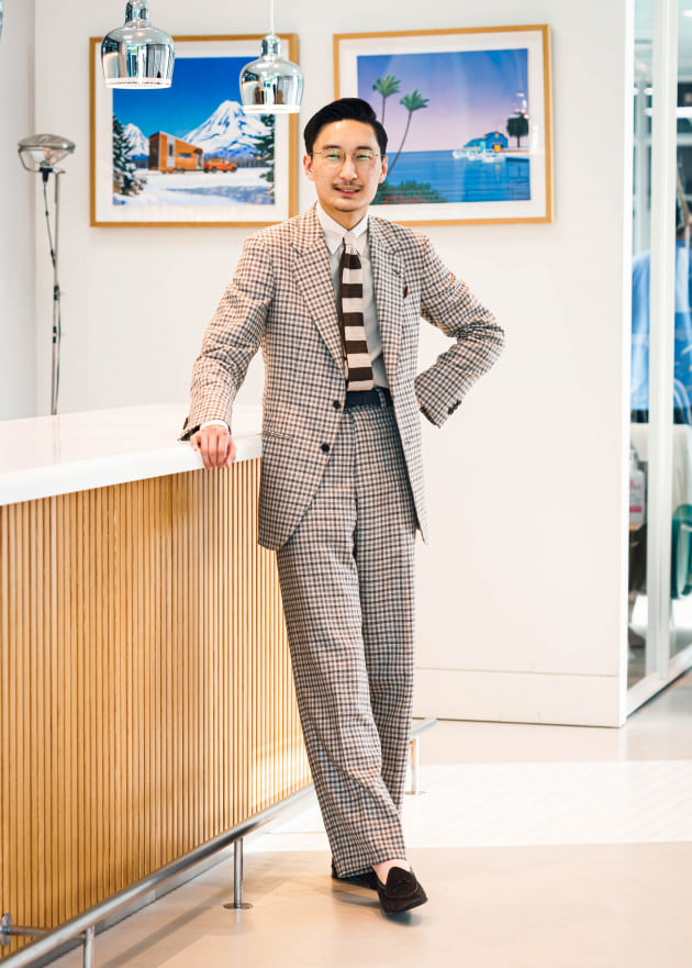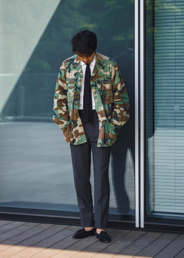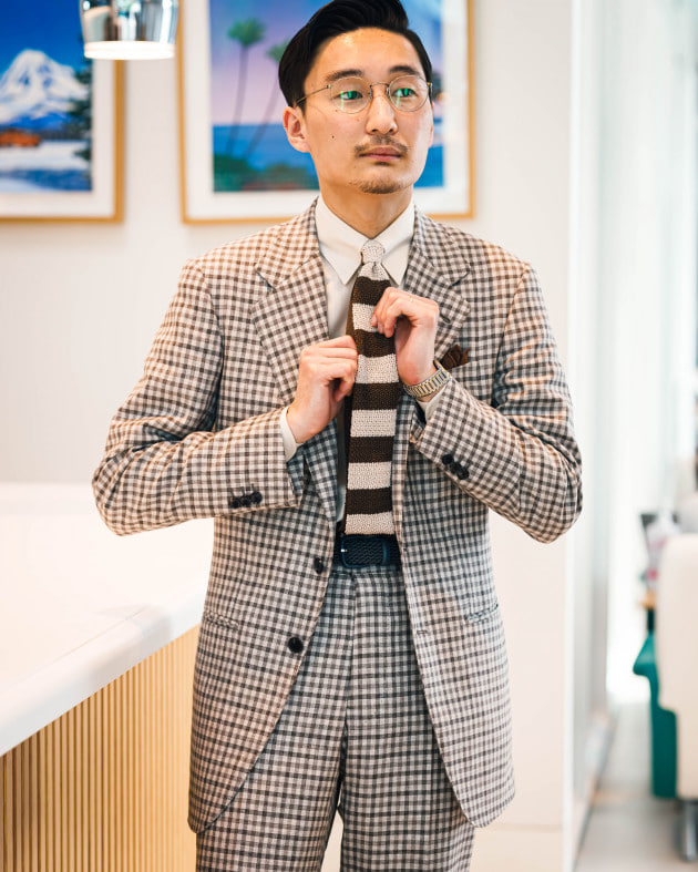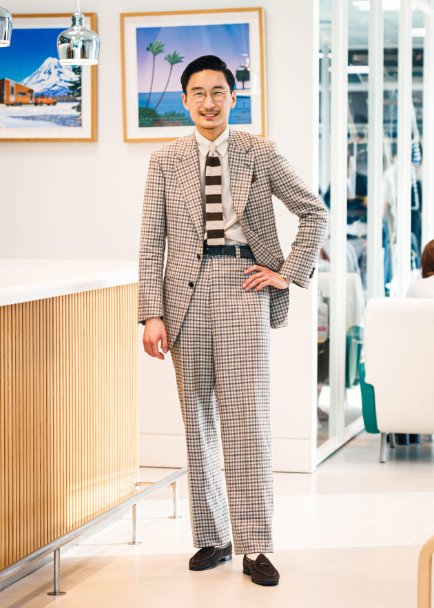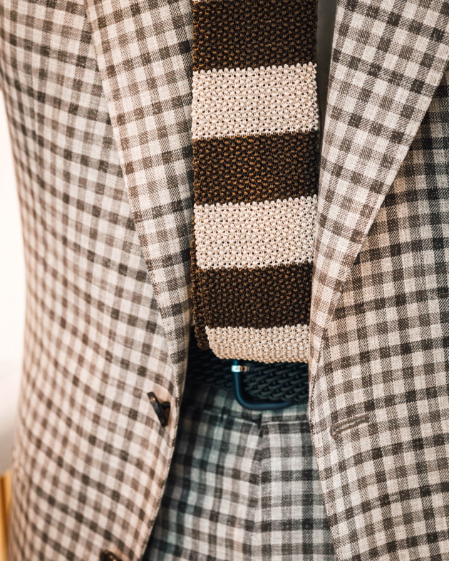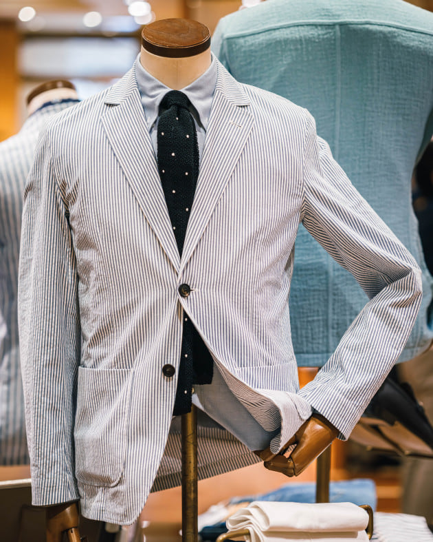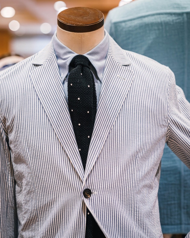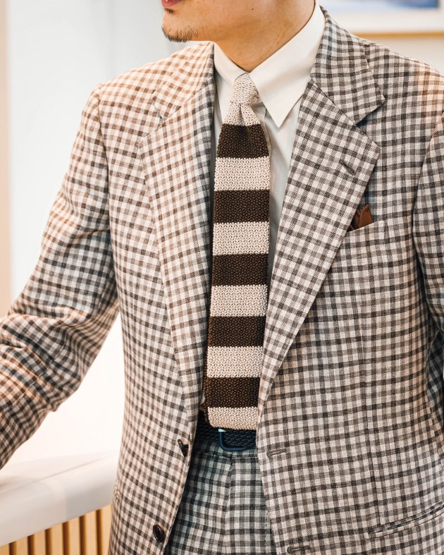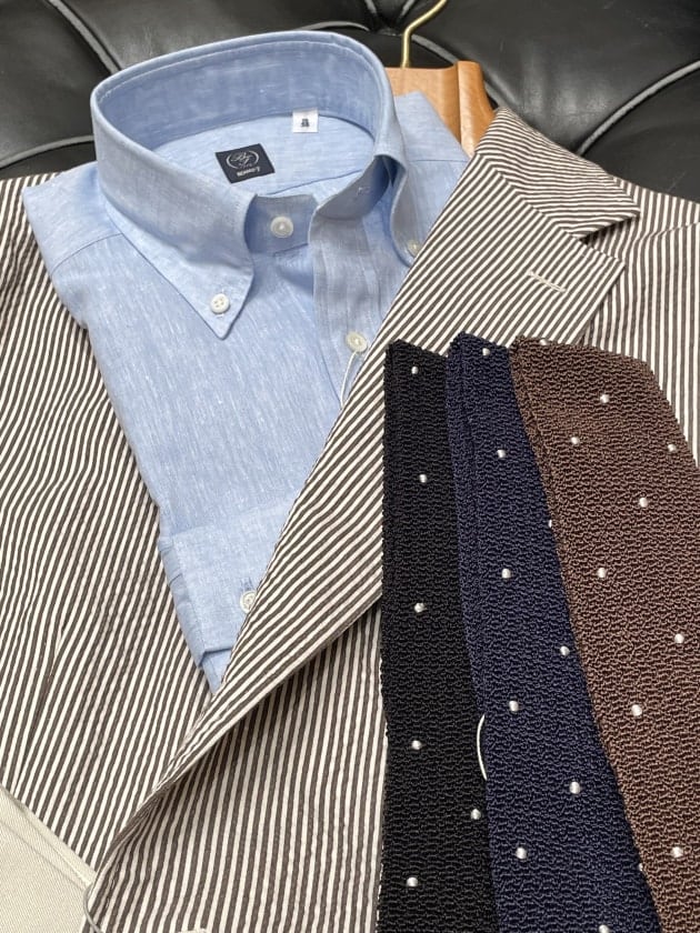 ニットタイでコーディネートしてみました。インナーはサマーニットやポロシャツ合わせでもイイですよね。タイドアップの場合も軽快感がポイントでしょうか。ニットタイやプリントタイがオススメです。