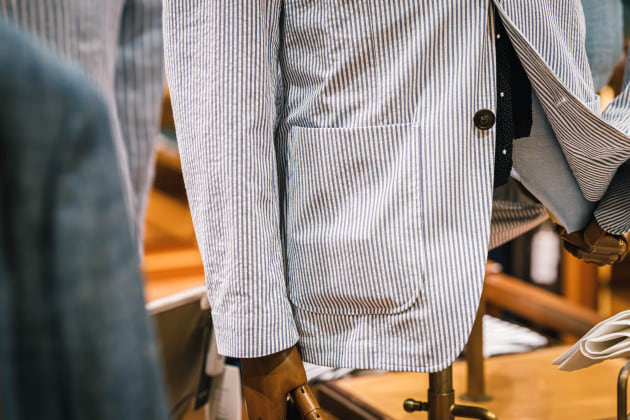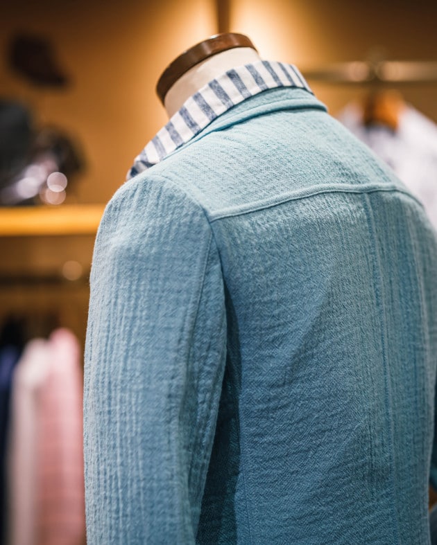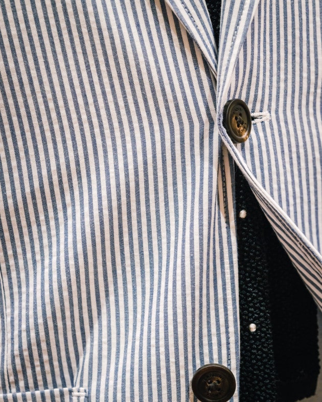 リネン59%なので、着用していくと次第にシワは入っていくと思います。そこも含めて夏らしいスポーティーな雰囲気が魅力のデニムスーツです。