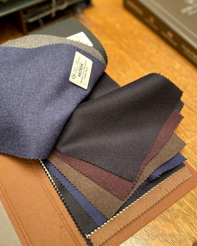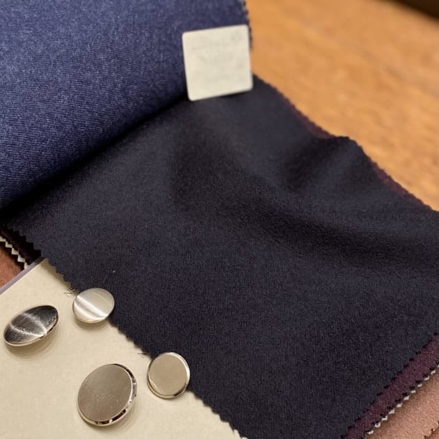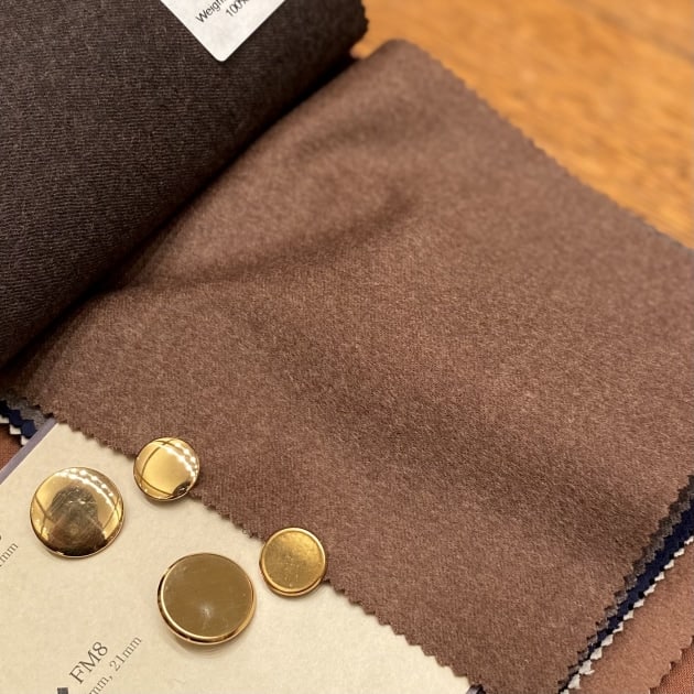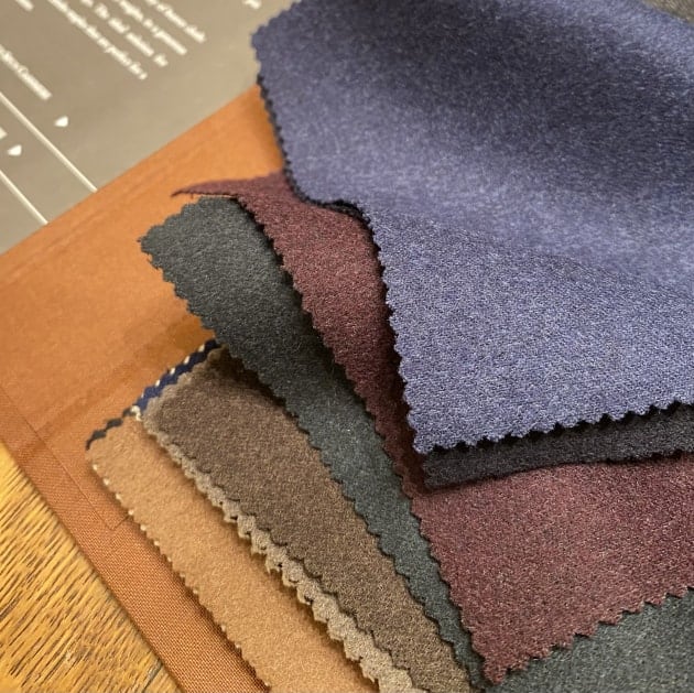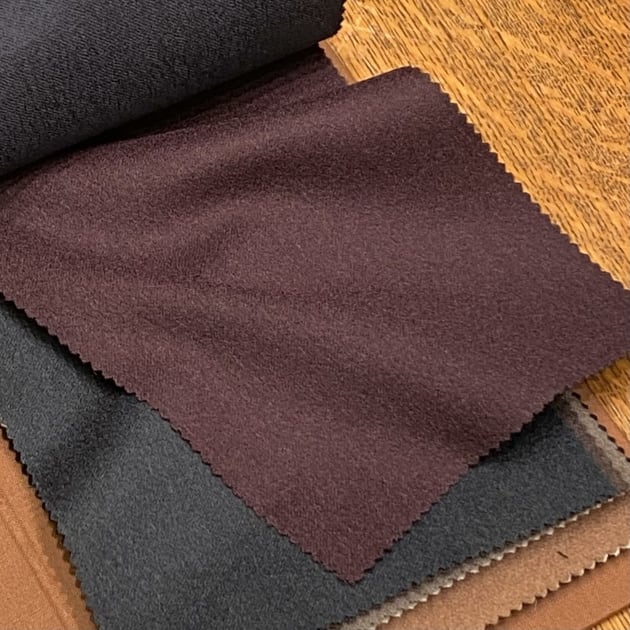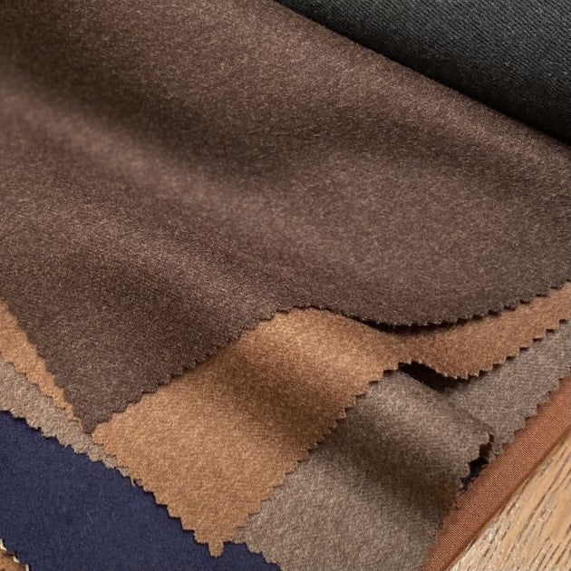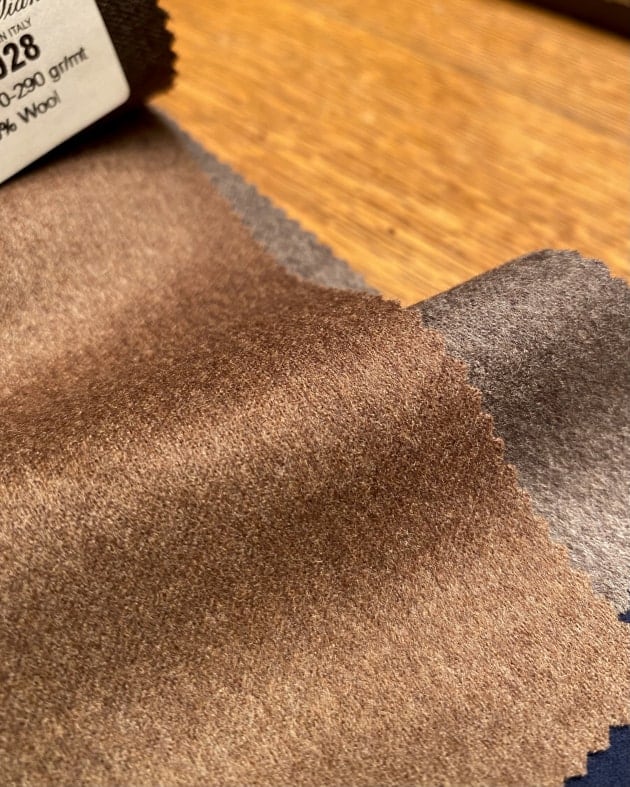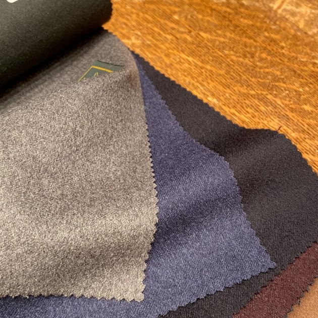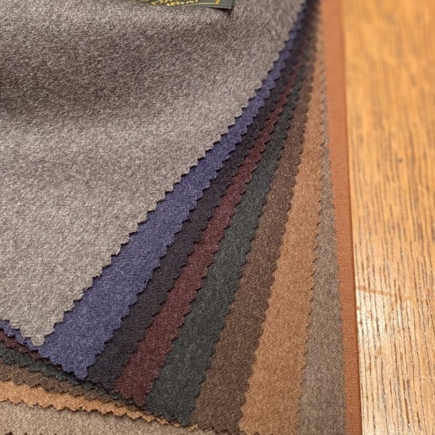 英国生地です。WILLIAM HALSTEADのウール100%。起毛の感じはやや控えめ。綾織りの生地となっております。色合いもなかなか素敵で、