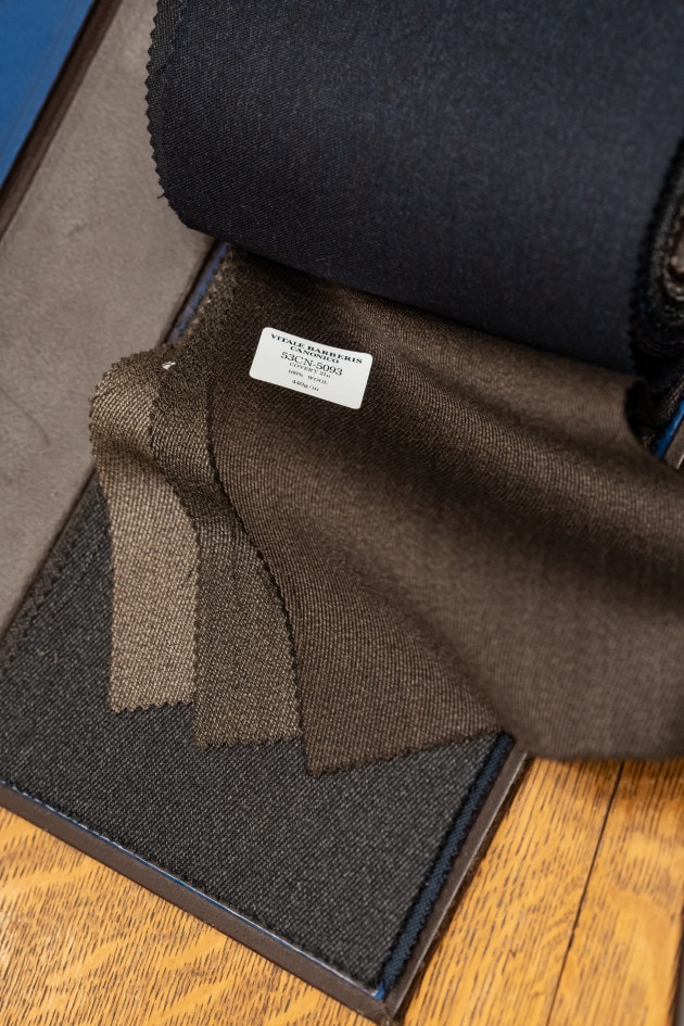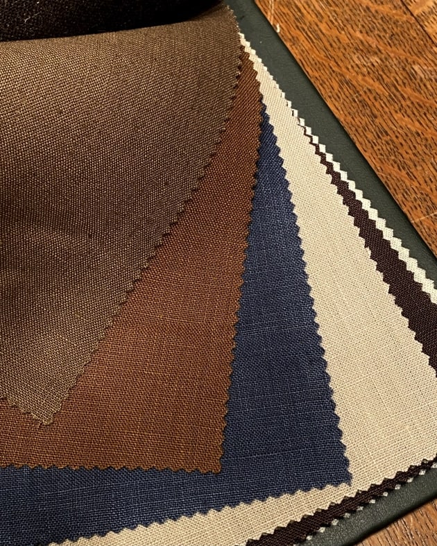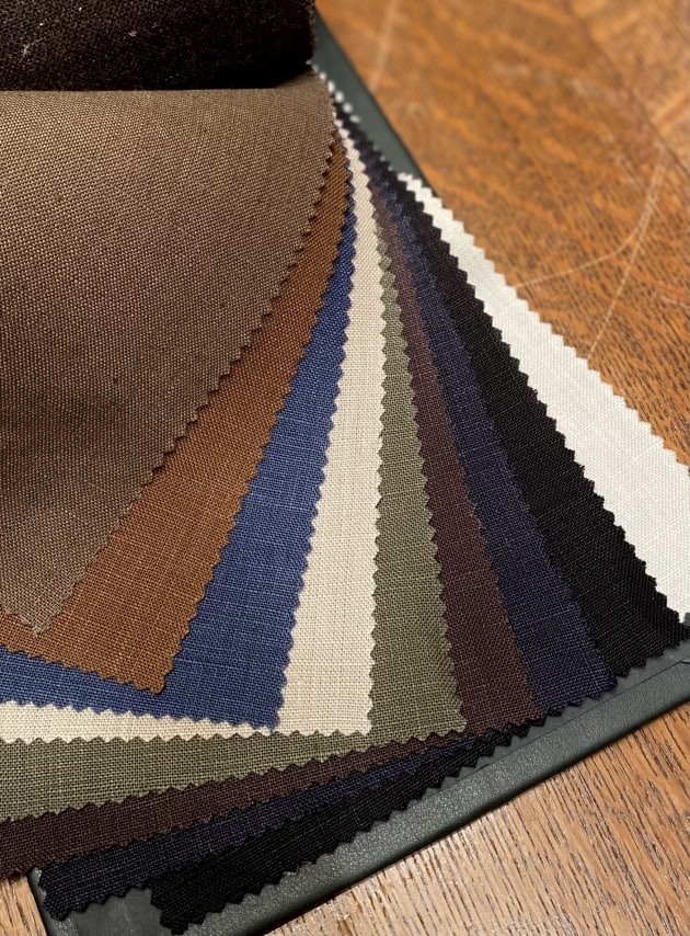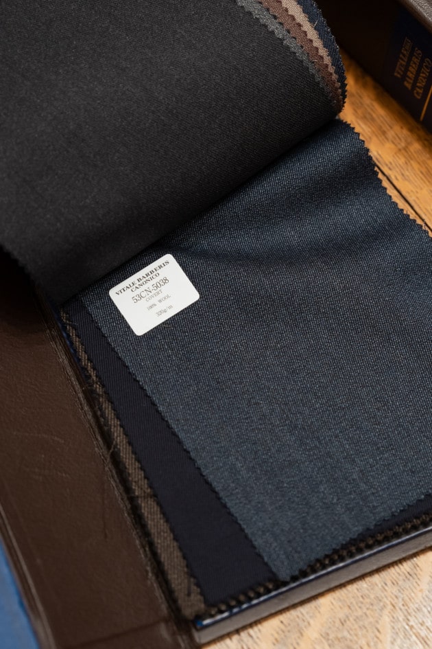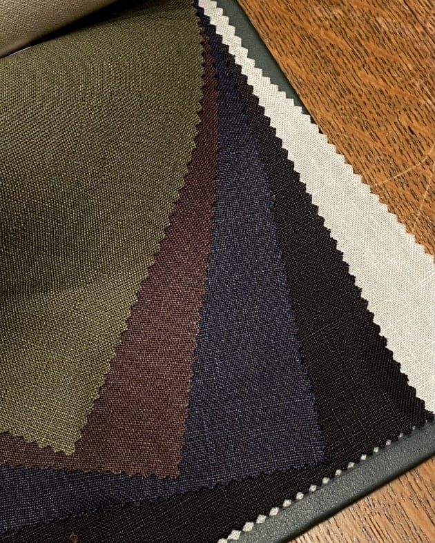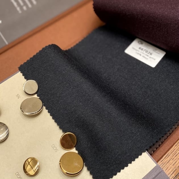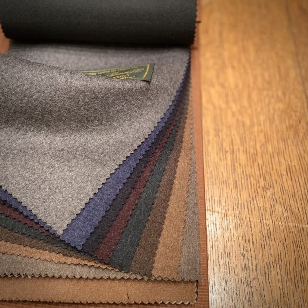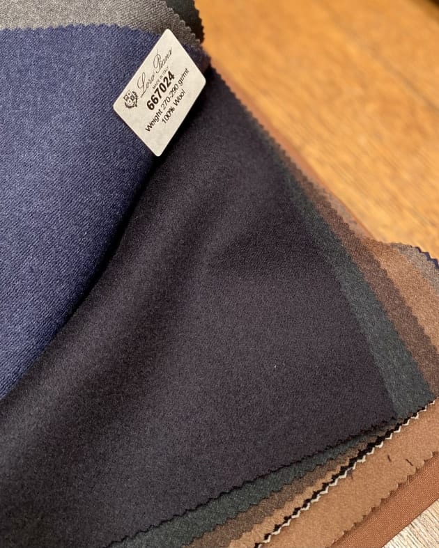 英国生地です。WILLIAM HALSTEADのウール100%。起毛の感じはやや控えめ。綾織りの生地となっております。色合いもなかなか素敵で、