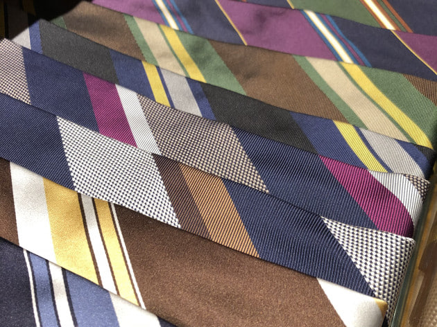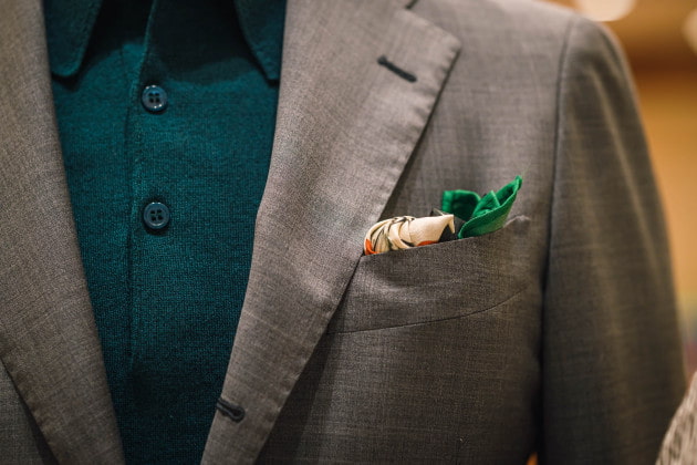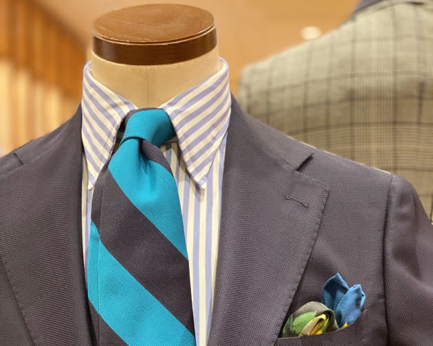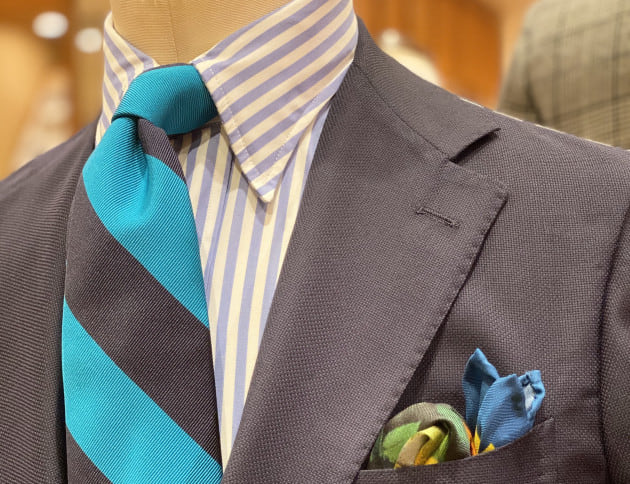 ターコイズに淡いパープルの配色が洒落たタイは〈Spacca neapolis〉。スフォデラータ仕様の仕上げでふわっと風に靡く、エレガントな一本です。