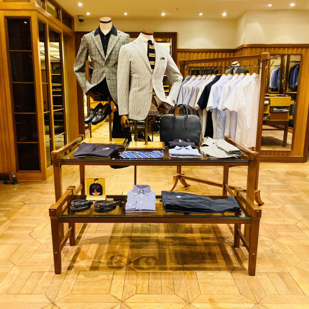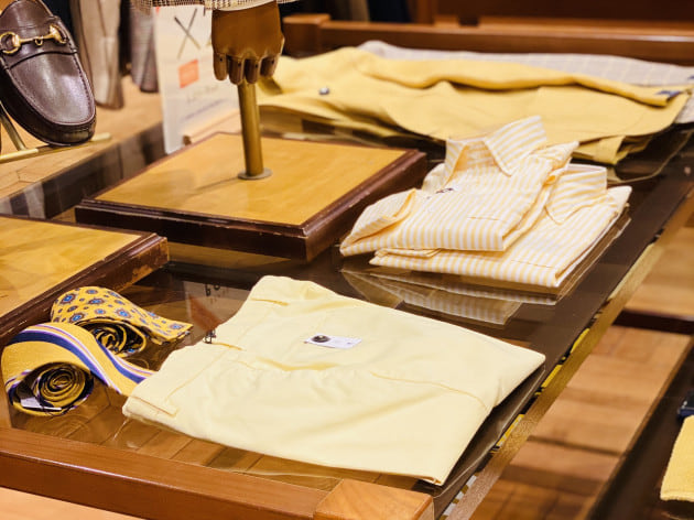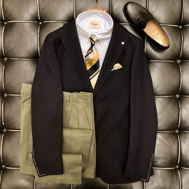 爽やかなシアサッカースーツスタイル。シンプルながら洒落た色遣いとこなれたサイジング。敢えてアメリカンに寄せすぎず、微妙にずらしているところも非常にモダン。さすがのバランス感覚です。