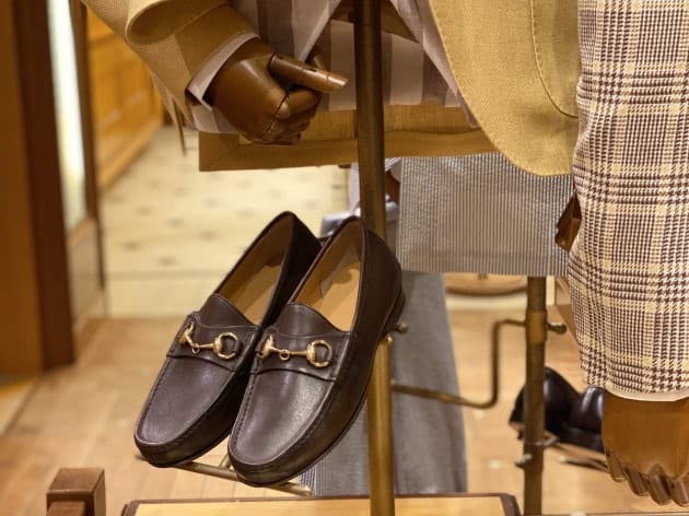 シューズはブラックコードバンのベルテッドローファー。アメリカンかつ男らしい雰囲気と華奢な上品さを併せ持った絶妙なルックスのシューズ。キッカーバックのディテールがさりげないアクセントに。