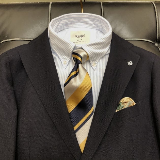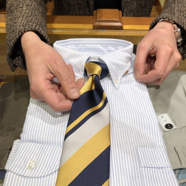 この日のVゾーンはボタンダウンシャツにプリントタイ。アメリカンに寄りがちなシアサッカーをフレンチシックなレトロプリントで中和。潔いカラーリングも春夏シーズンにクリーンに映えます。