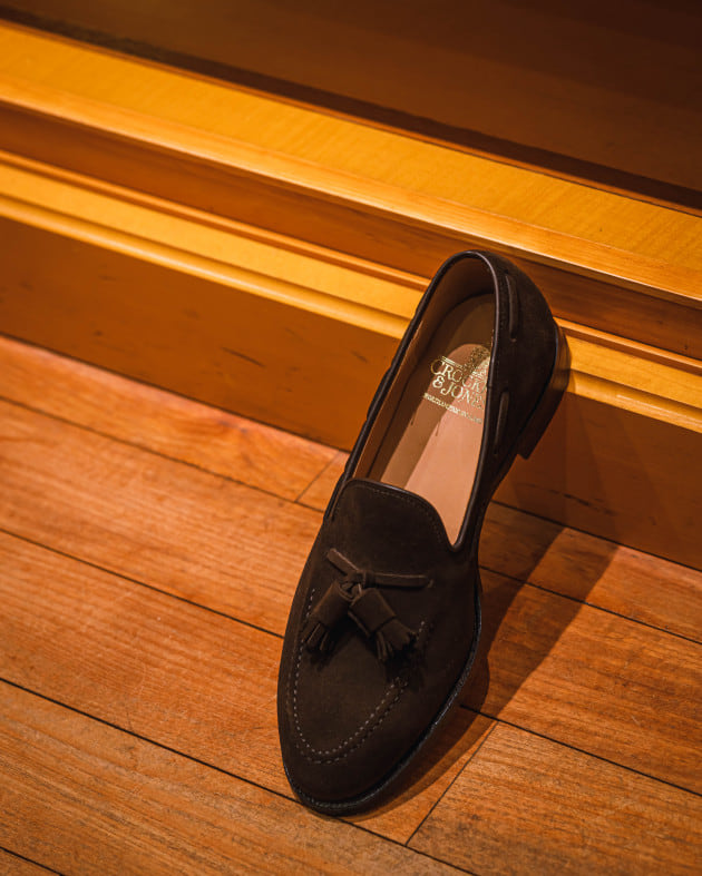 ボトムにはOYSTERカラーの細畝コーデュロイを。<AUBERGE>の5ポケットです。適度にヌケ感がありつつも、綺麗めな大人カジュアルスタイルにバッチリハマる、使い勝手の良いパンツです。