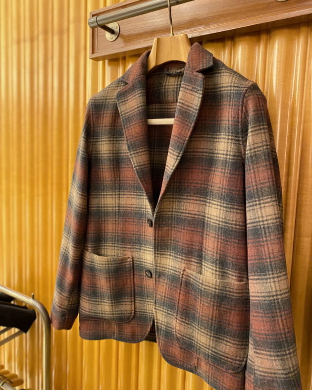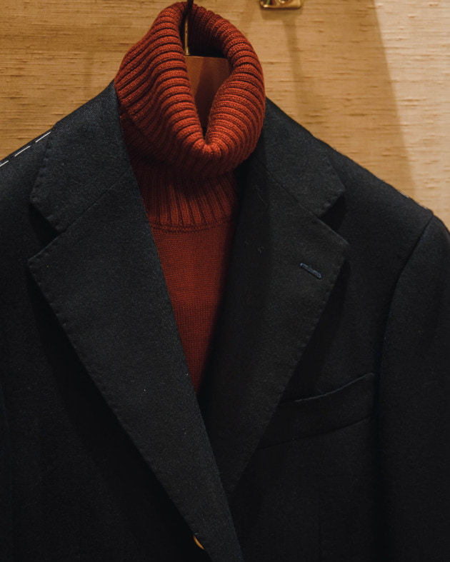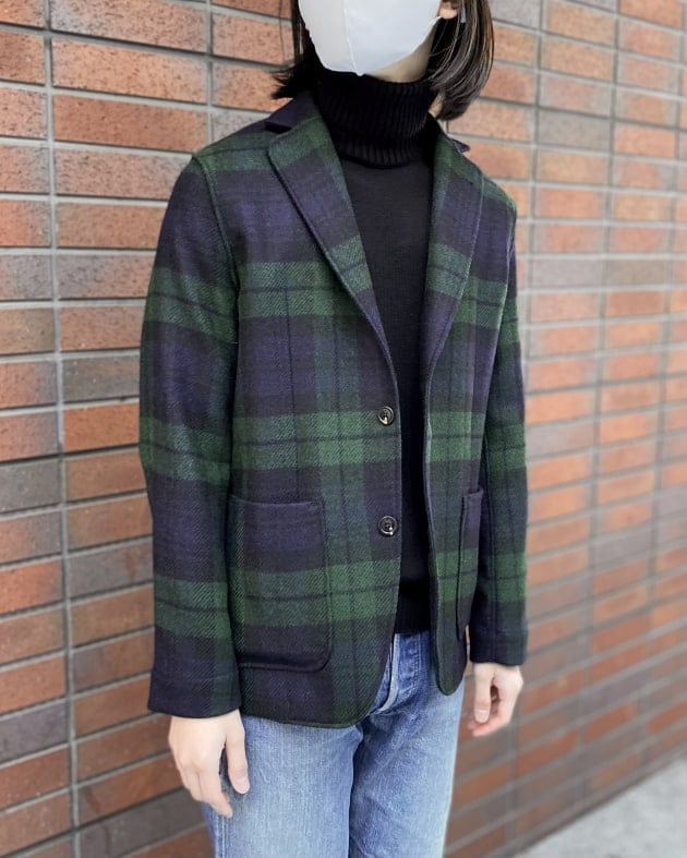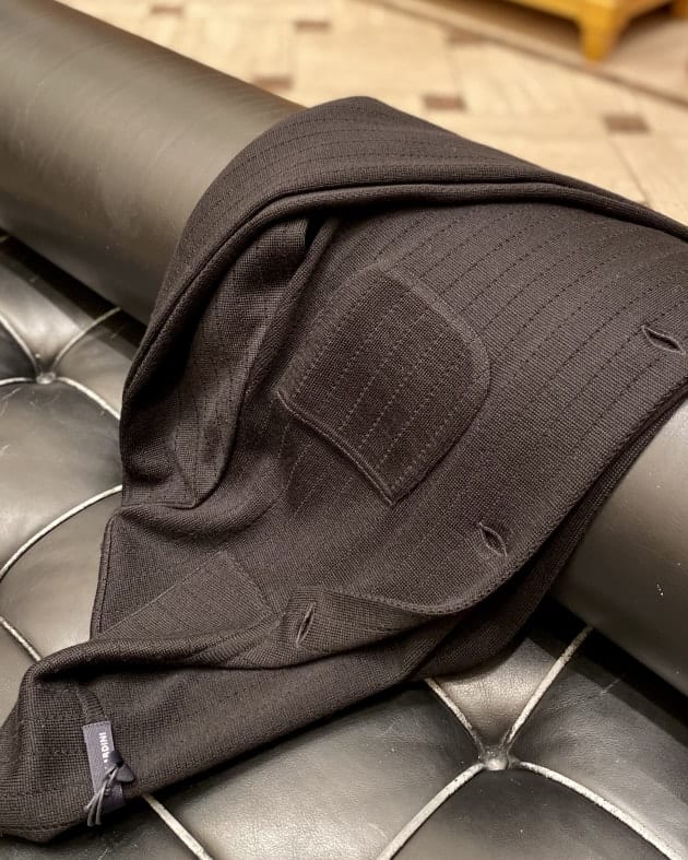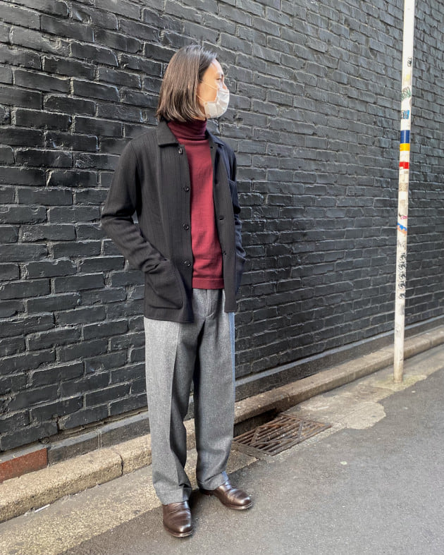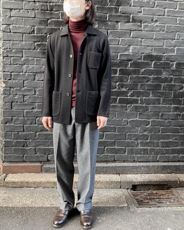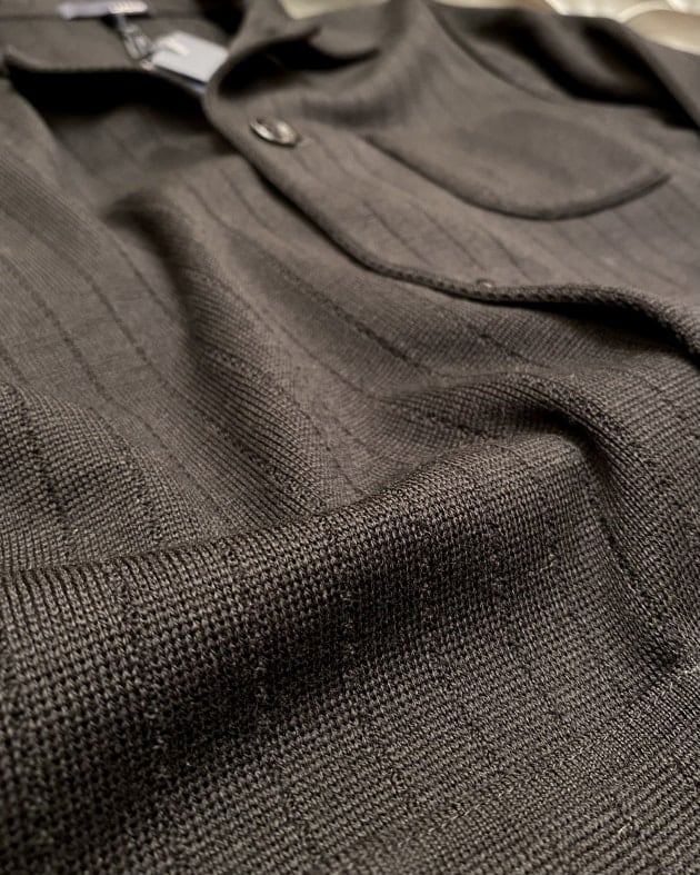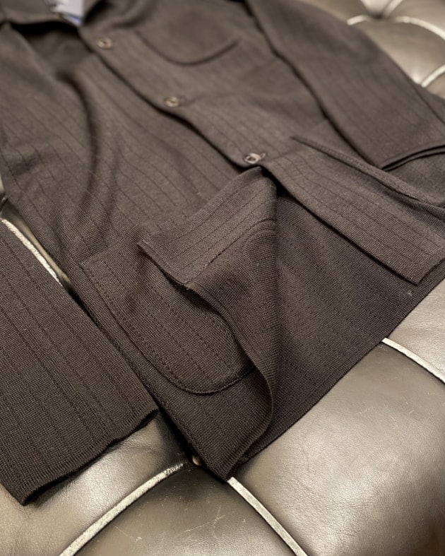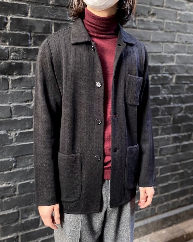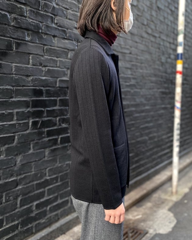 ボディはヘリンボーン織りのウールニット生地、襟の縁取りなど各所にパイピングが施された仕様となっております。