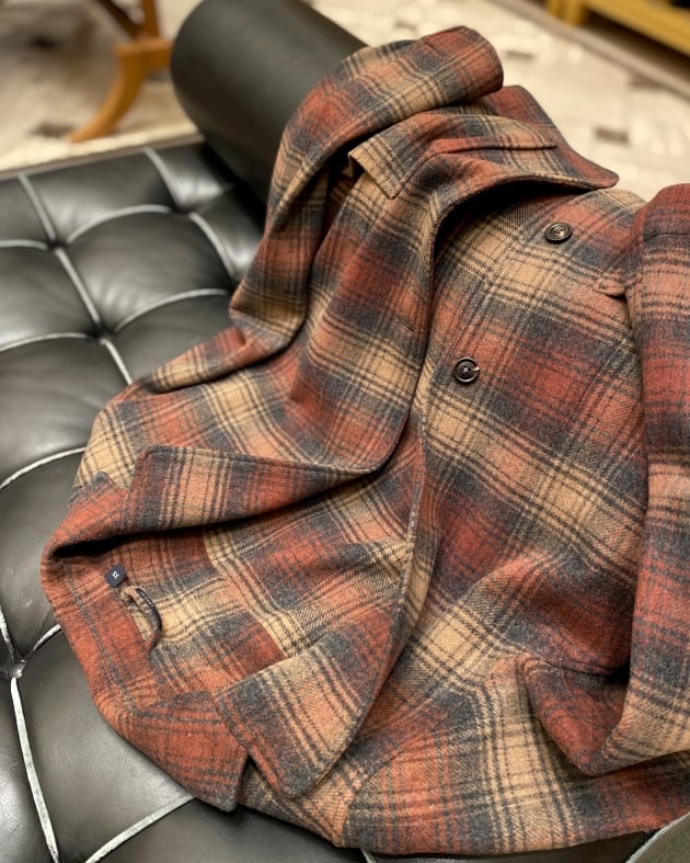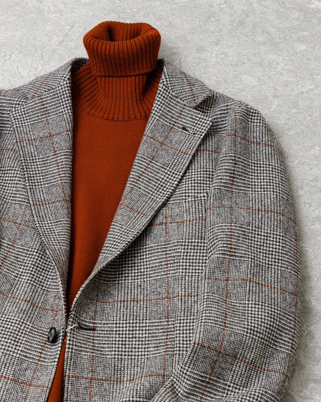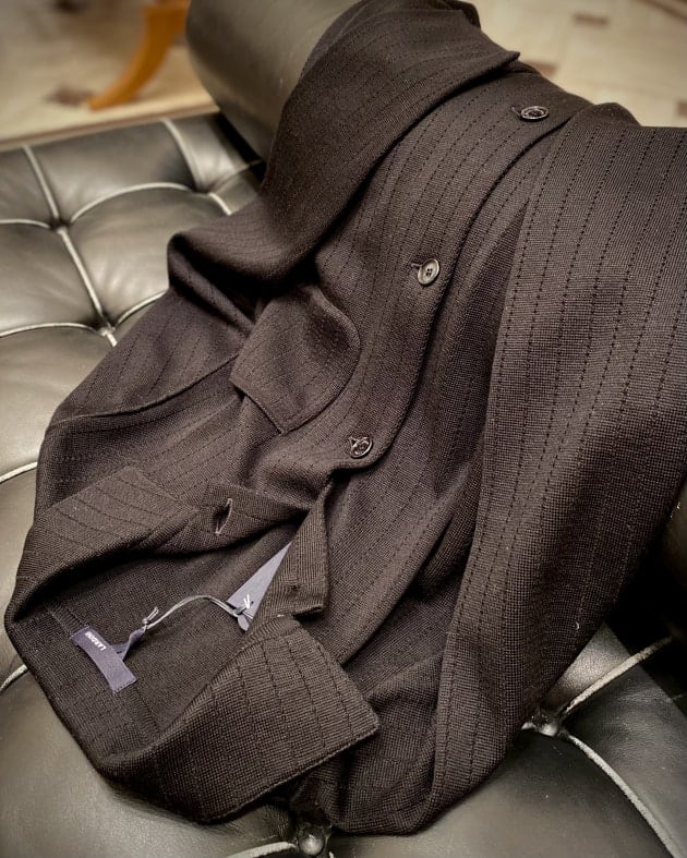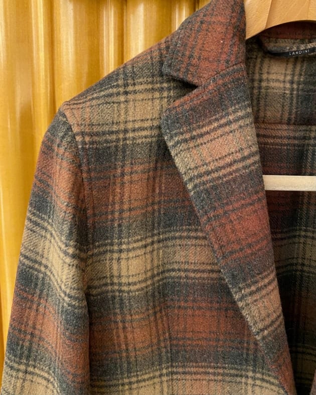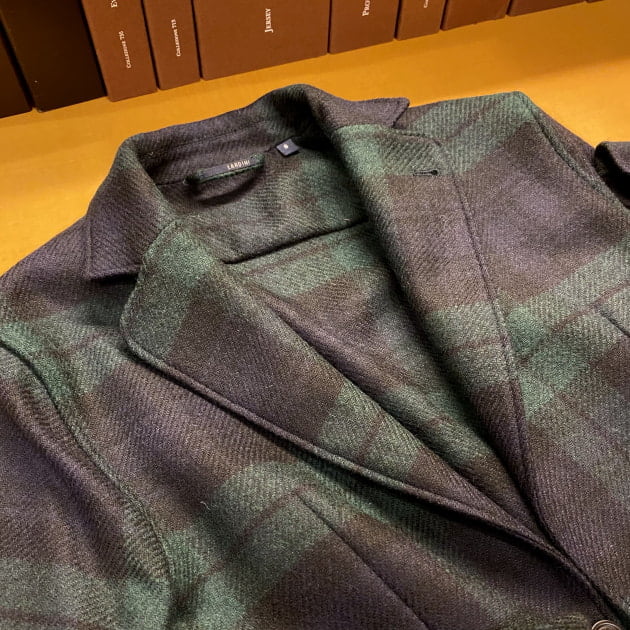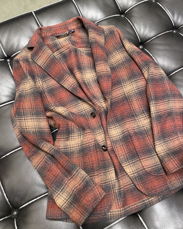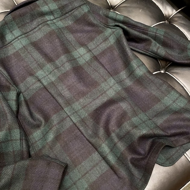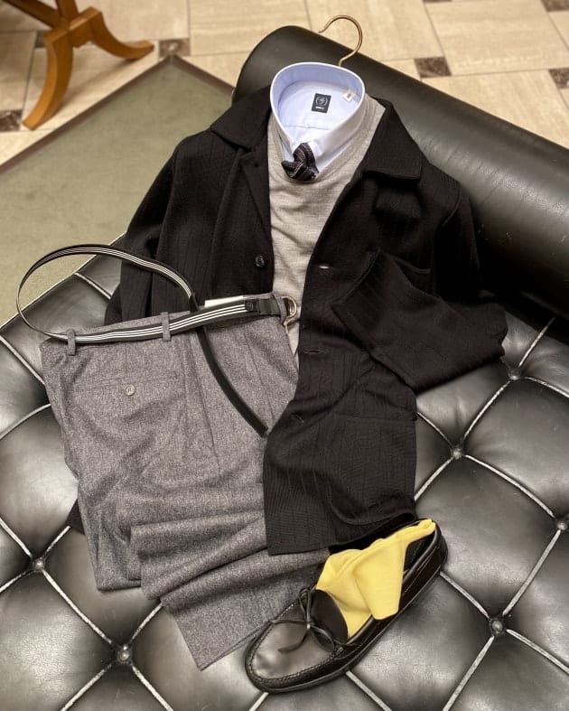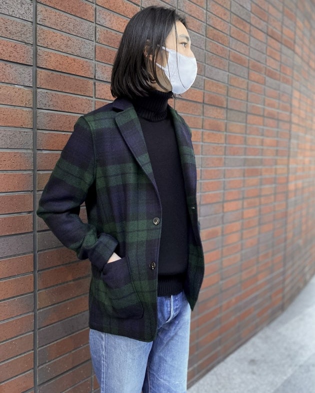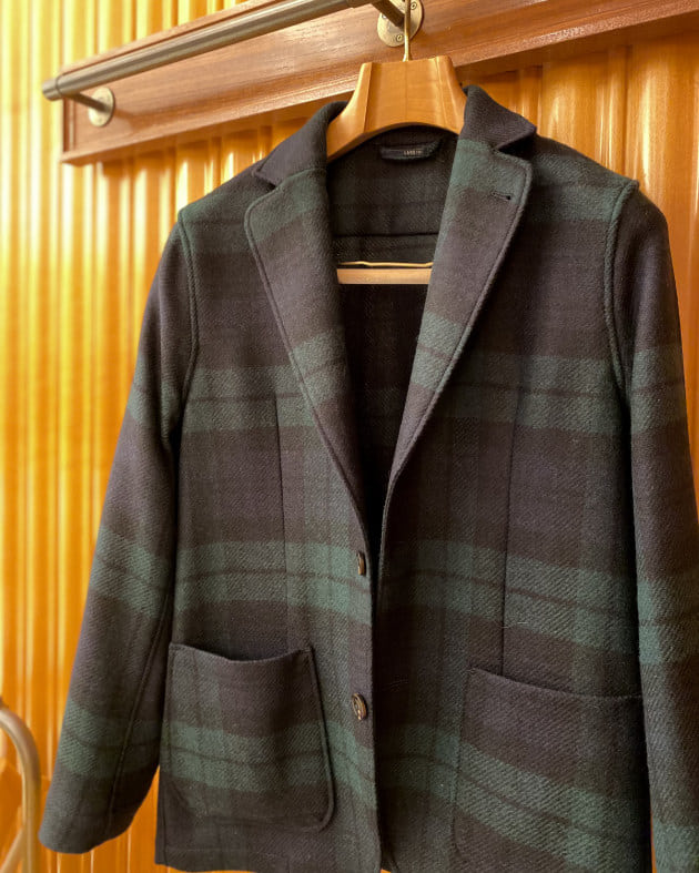 ボディはヘリンボーン織りのウールニット生地、襟の縁取りなど各所にパイピングが施された仕様となっております。