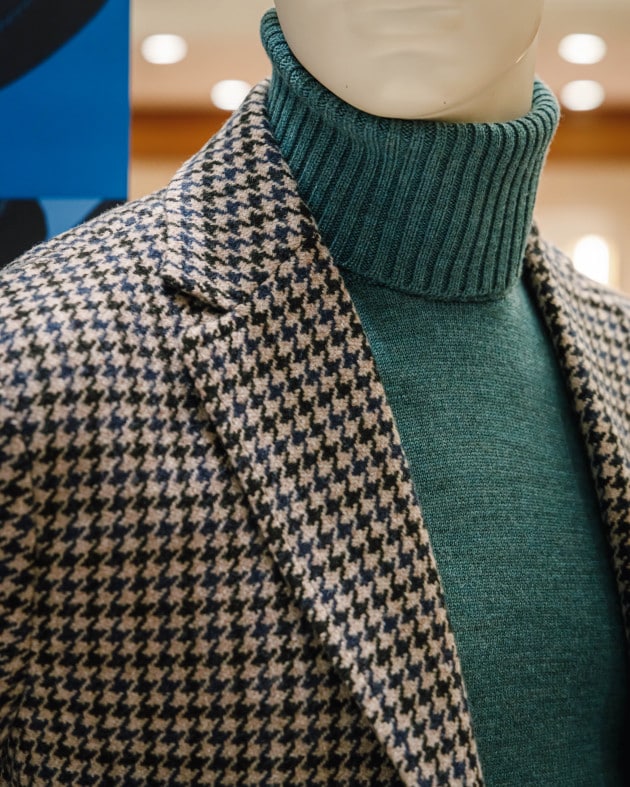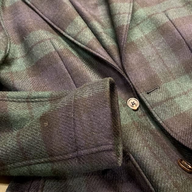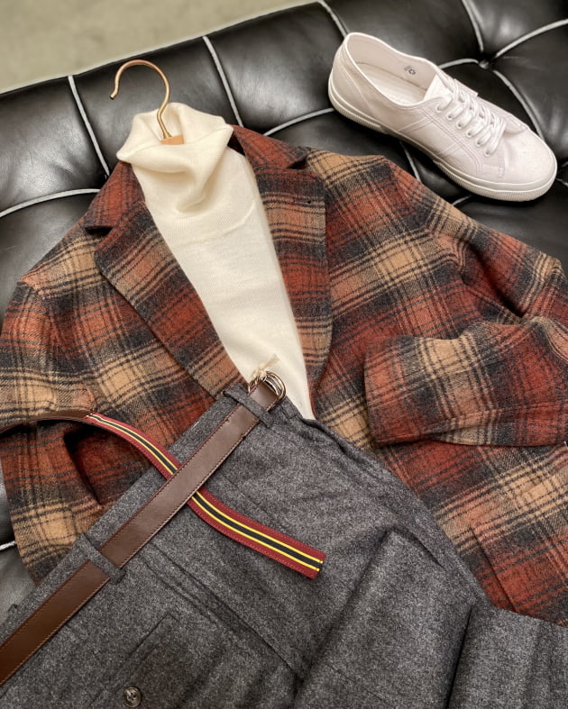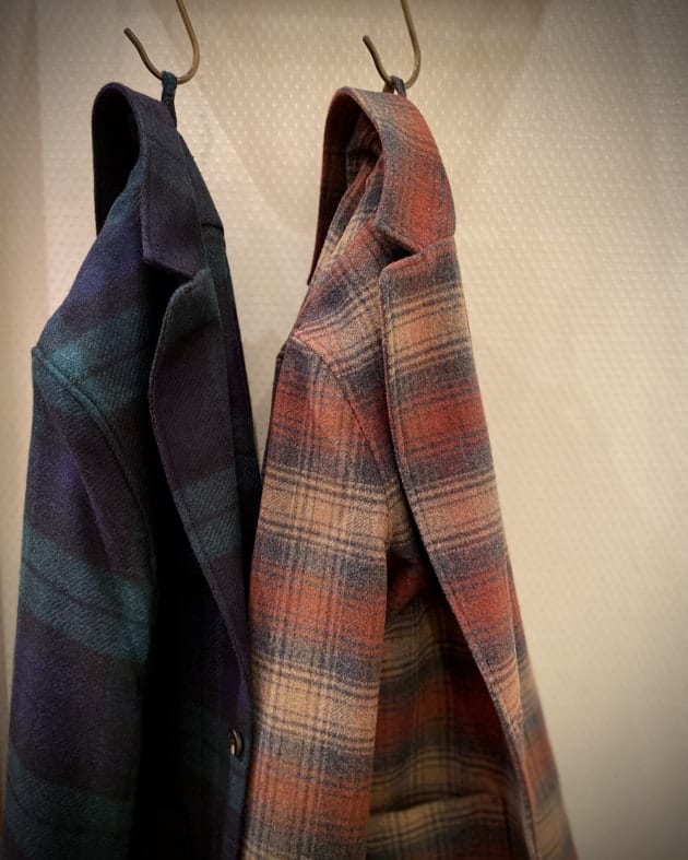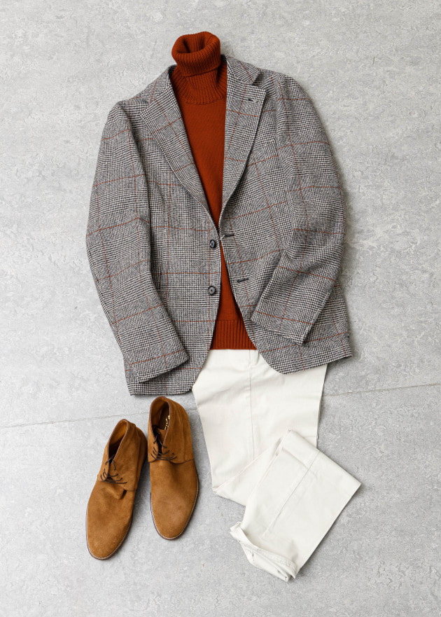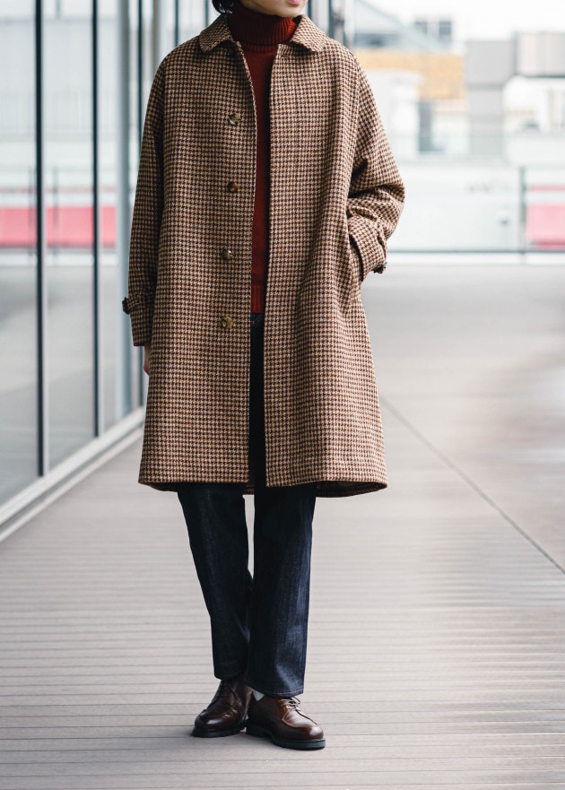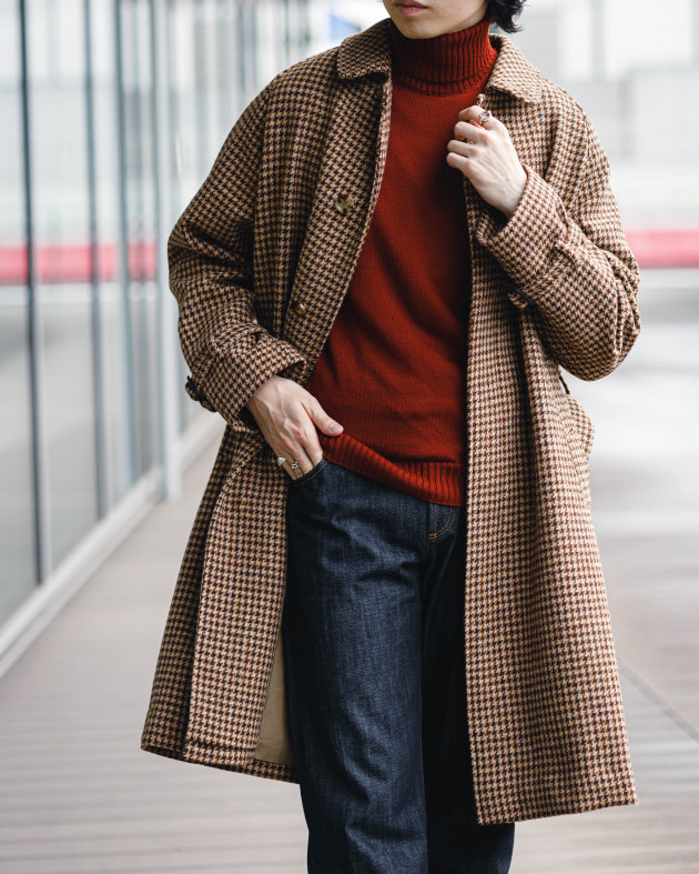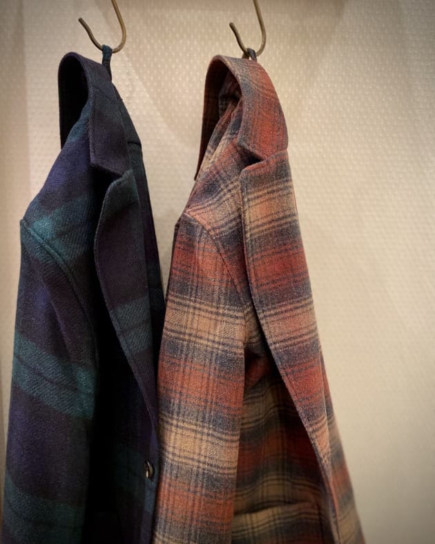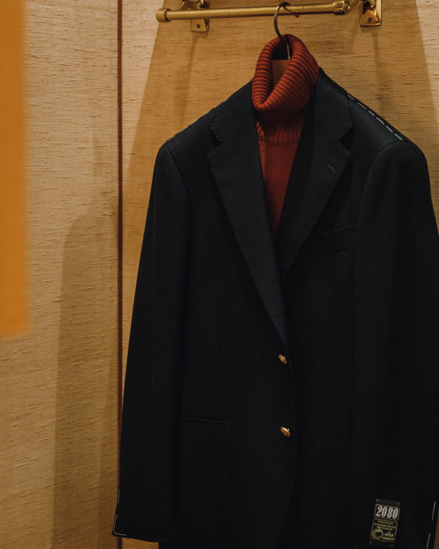 ボディはヘリンボーン織りのウールニット生地、襟の縁取りなど各所にパイピングが施された仕様となっております。