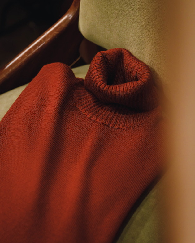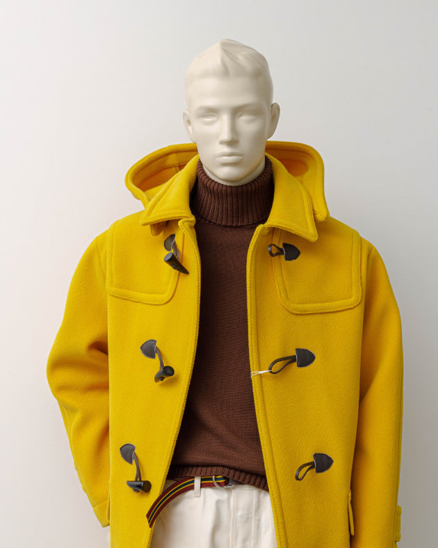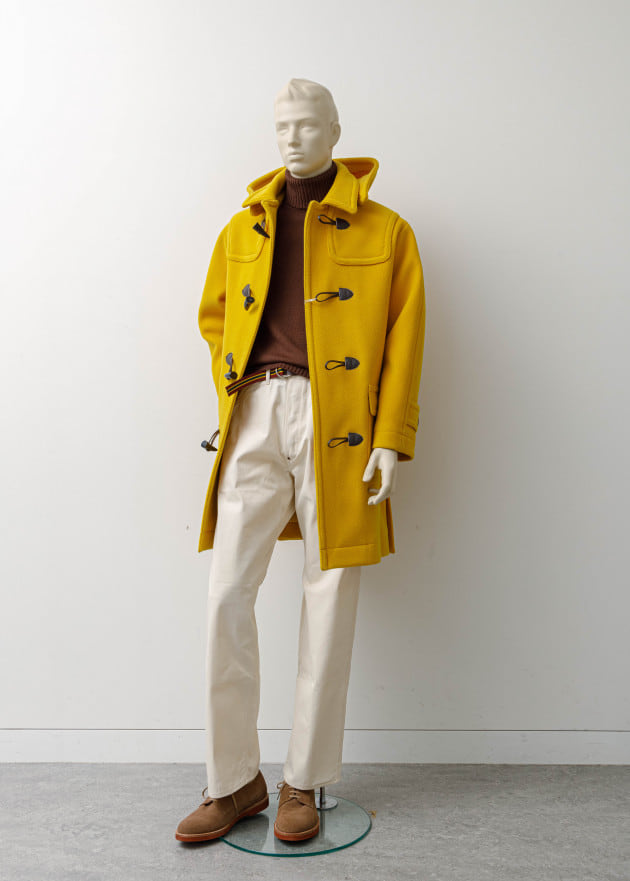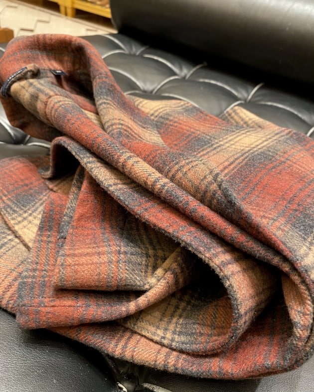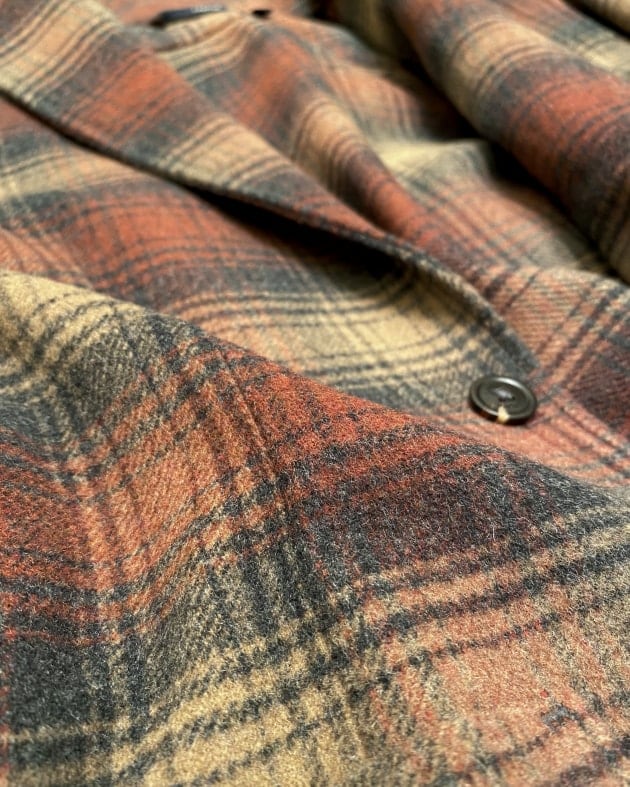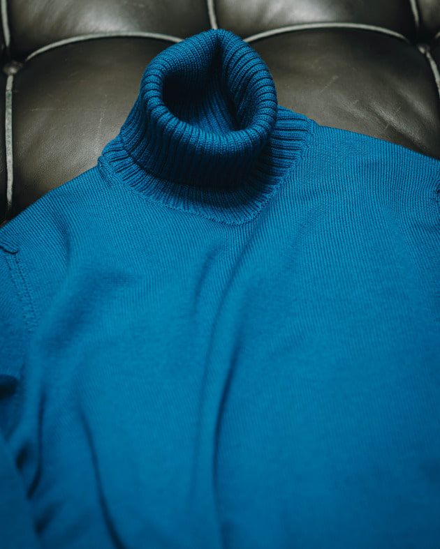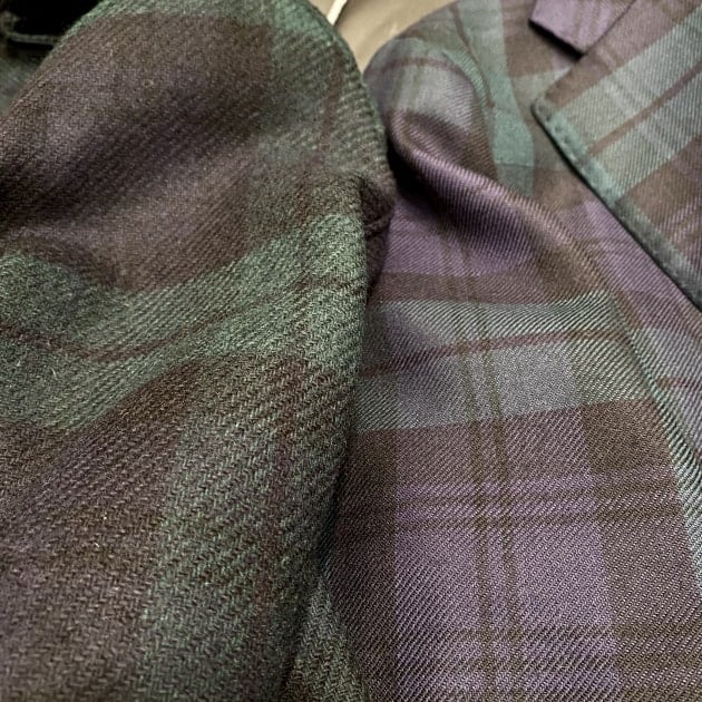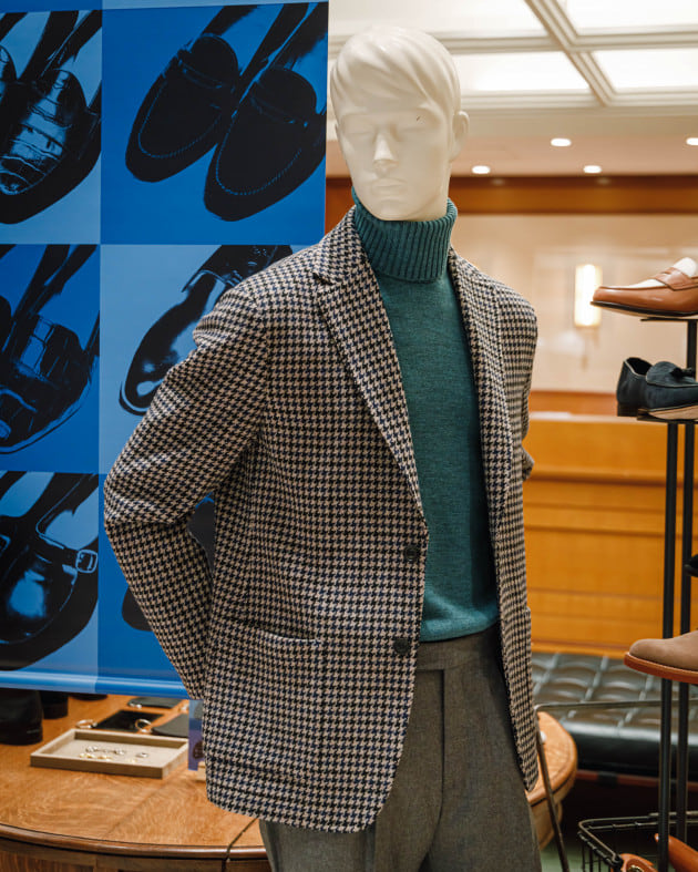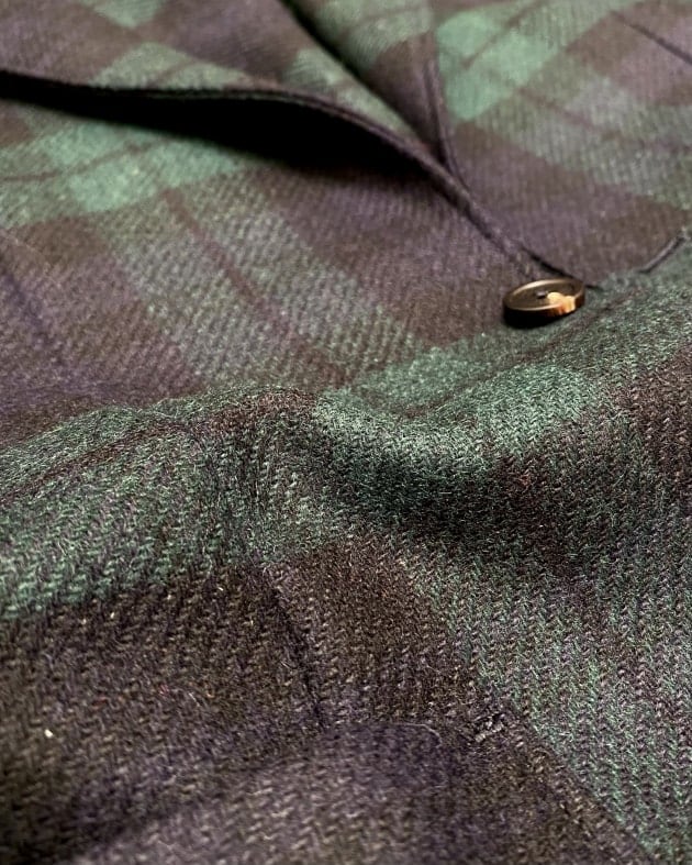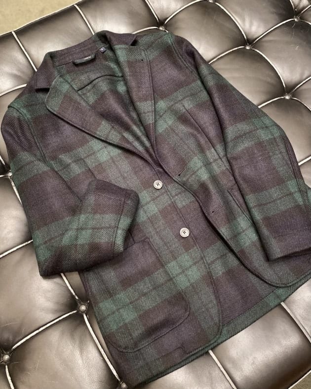 ボディはヘリンボーン織りのウールニット生地、襟の縁取りなど各所にパイピングが施された仕様となっております。