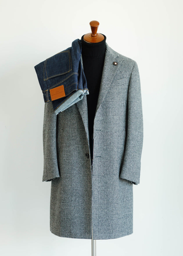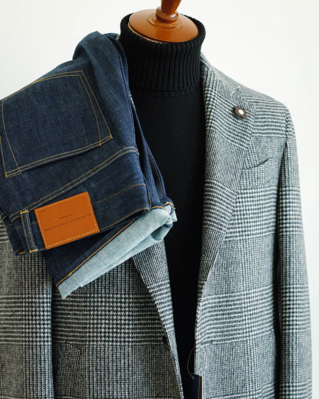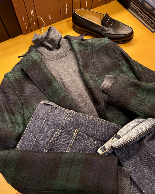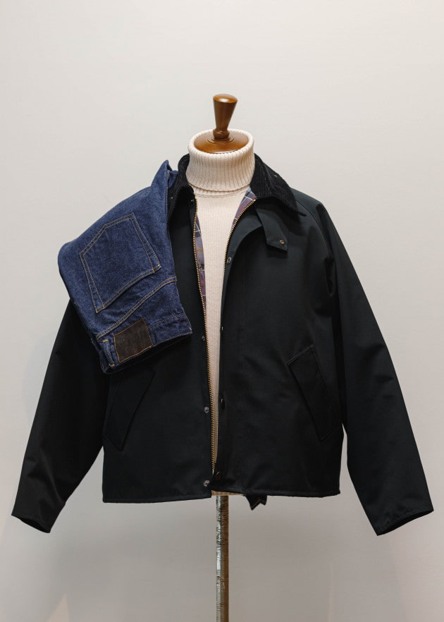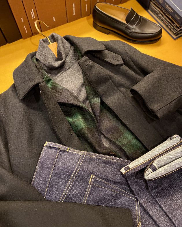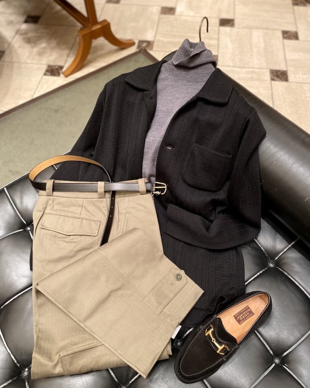 やはりコーディネートはシンプルに合わせたいです。今回はインナーにBLACKカラーの12ゲージニット、ボトムにはジーパンを持ってきました。