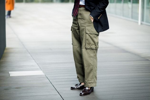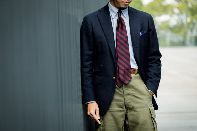 アメリカントラッドなブレザースタイルにミリタリーの要素を加えたミックススタイル。オーセンティックな、スタンダードなアイテム同士の組み合わせをこなれて魅せているところはさすがです。洋服を知っている、好きでいるからこそできる装いですね。