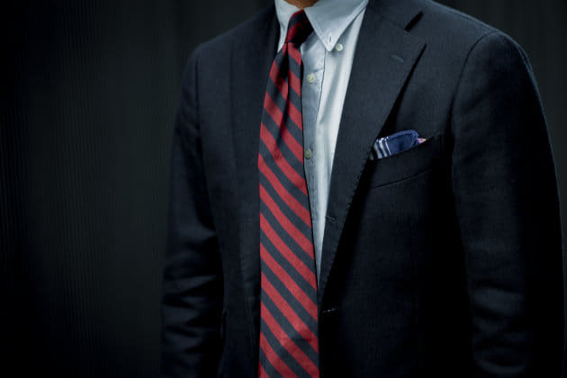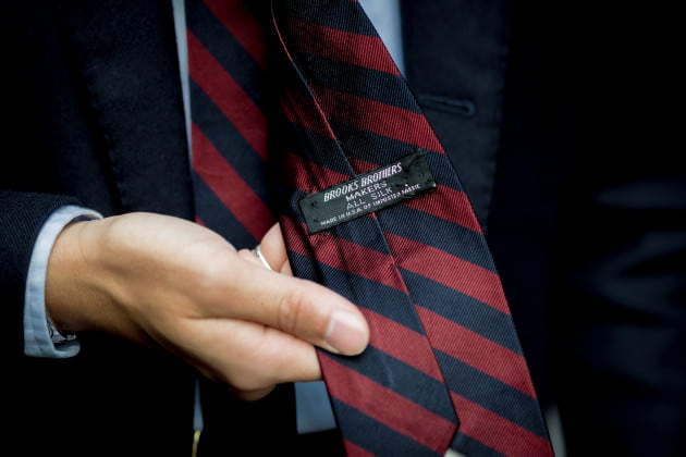 タイは<Brooks Brothers>。ネイビー×ボルドーの右下がりはまさに王道のトラッド。