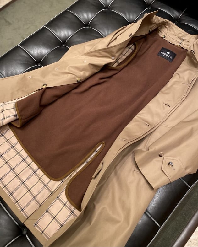 <GRENFELL>のハンティングジャケットにブラックのカノコポロ、グレーのウールパンツ。