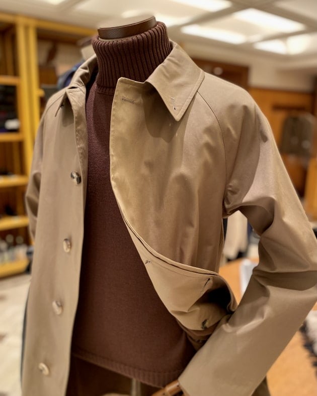 こちらの「BEDALE」はピーチスキン素材でマットな質感が特徴的。オイルドのようなタッチながらノンワックスの非常にハイブリッドなアイテムです。ネイビー×ブルーの奥行きのあるボーダーニットも良い雰囲気。