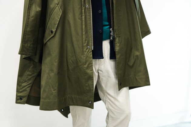 こちらのコーディネートではインナーのポロのサイズ感をやや上げることがポイント。少しゆったりとしたフィッティングで裾をブラウジングすると、こなれた雰囲気に仕上がります。ネックのサイズ感も緩めに設定して、ネッカチーフをふわっと巻くのがおすすめだそう。
