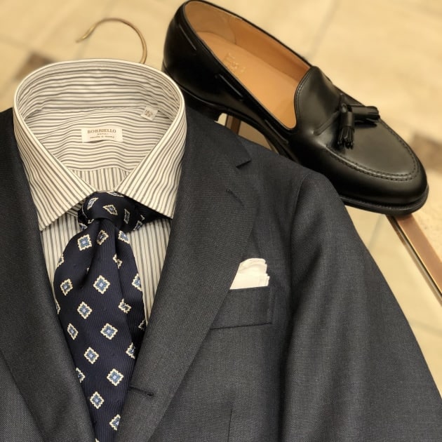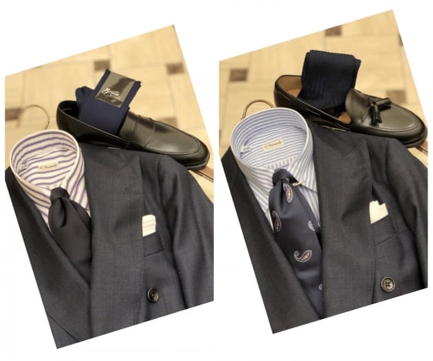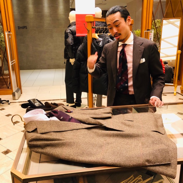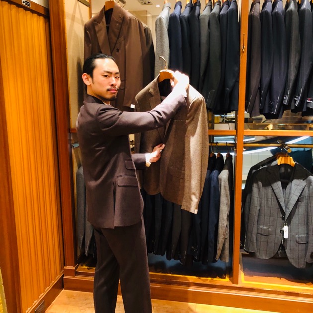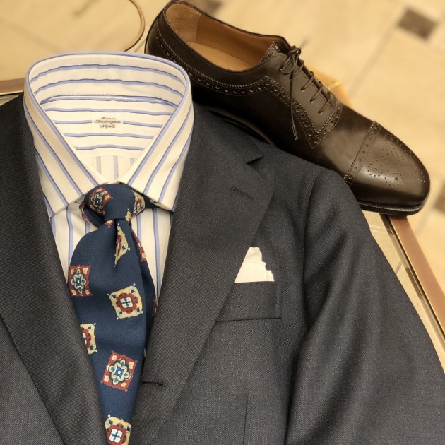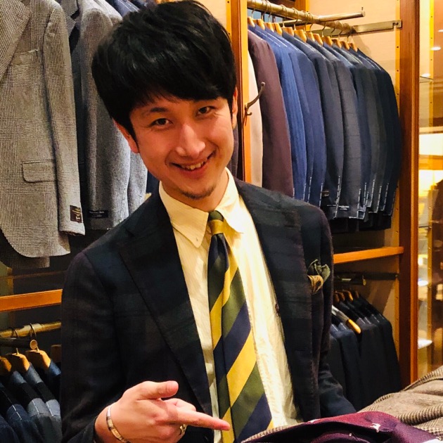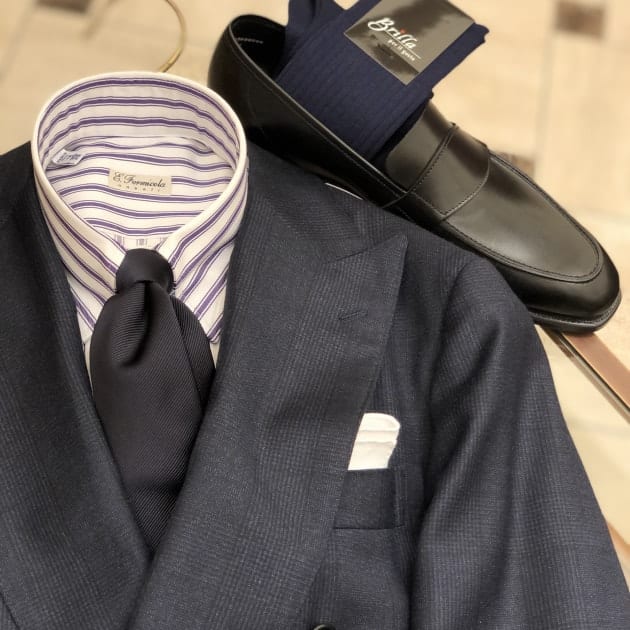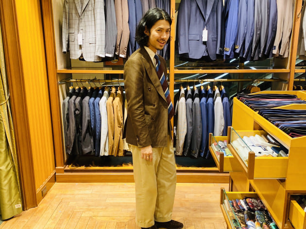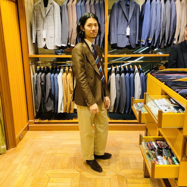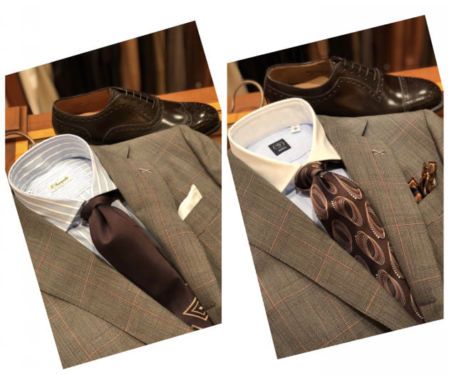 ブラウン×ネイビーのアズーロエマローネ。シャツ、タイ、パンツをグラデーションになるように組んでいて、非常に綺麗なコーディネートですね。ワイドカラーのシャツがオサムマンさんのこだわりです。