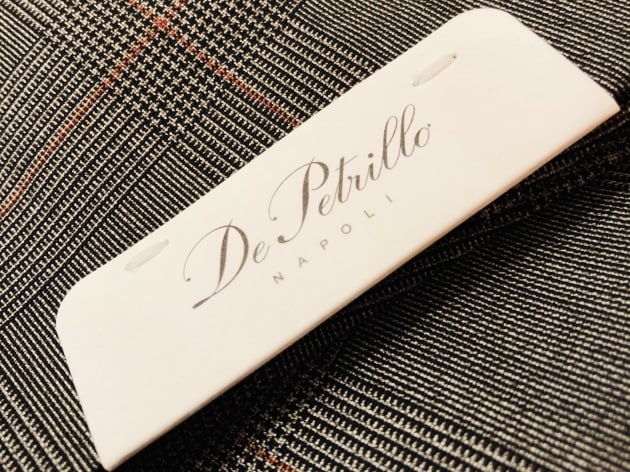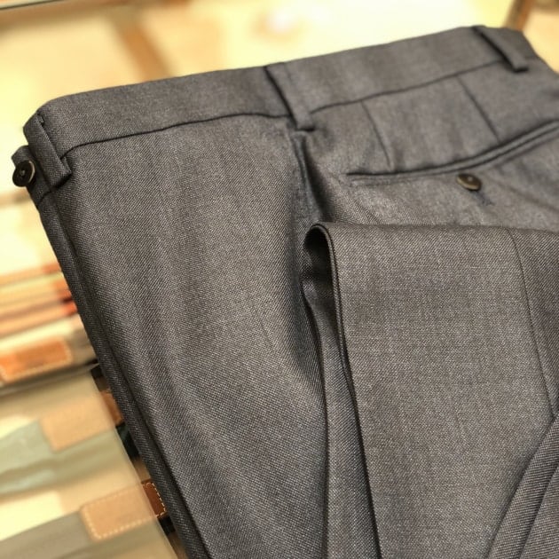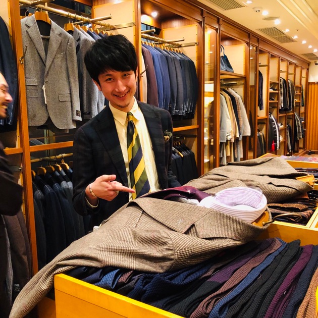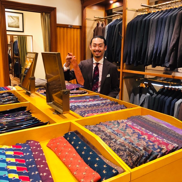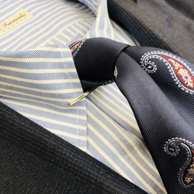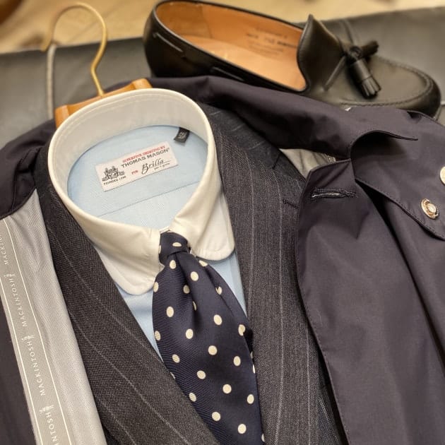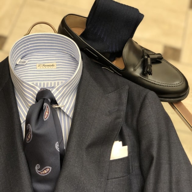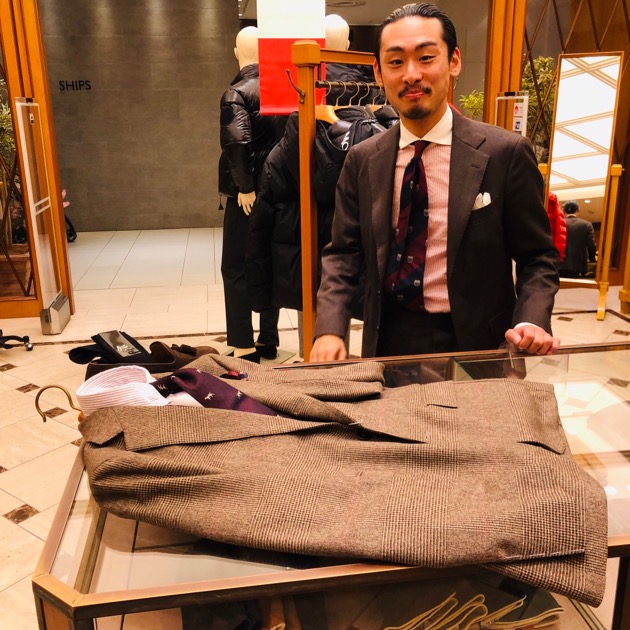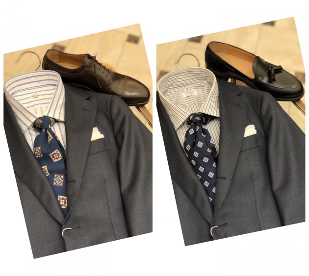 ブラウン×ネイビーのアズーロエマローネ。シャツ、タイ、パンツをグラデーションになるように組んでいて、非常に綺麗なコーディネートですね。ワイドカラーのシャツがオサムマンさんのこだわりです。