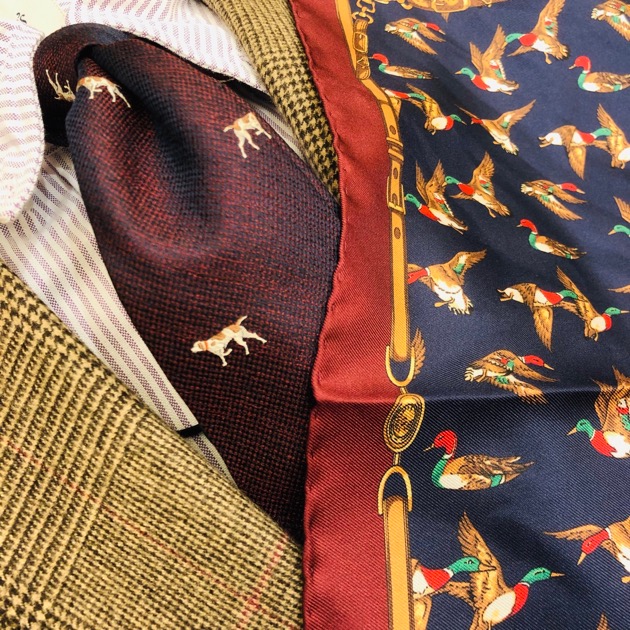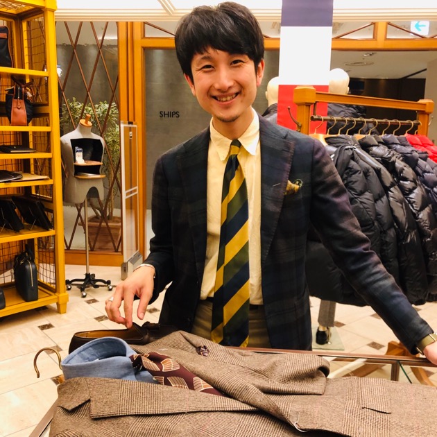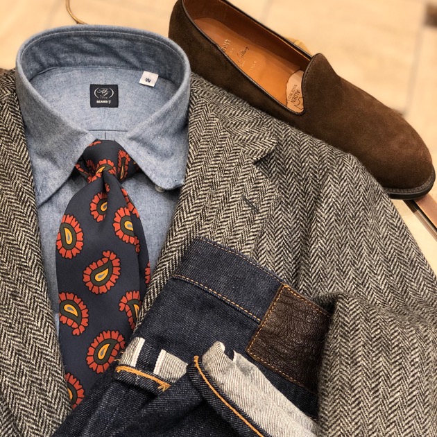 英国調のジャケットに、アメリカン、ミリタリーなテイストをミックスしたコーディネート。ブラウンジャケットにカーゴパンツと、少し野暮ったくなりそうな合わせですが、タイのボーダーが効いていて、しっかりとまとまっています。ごっちらしいですね。