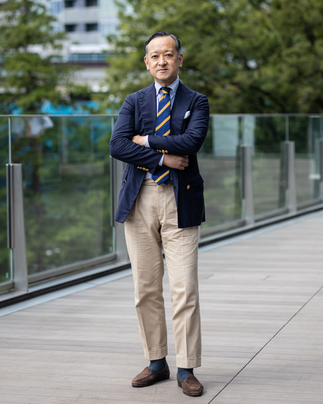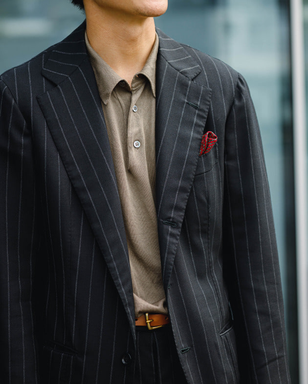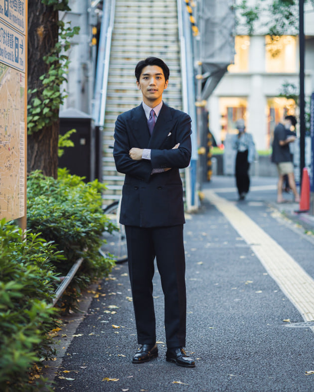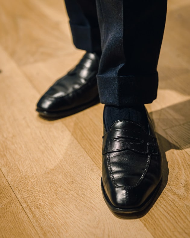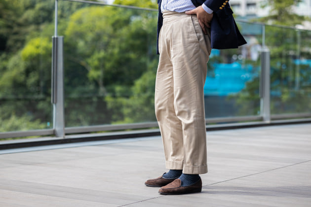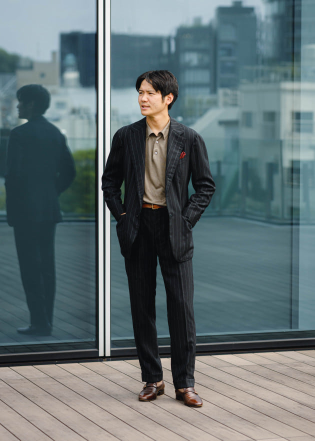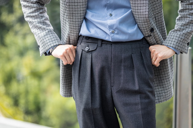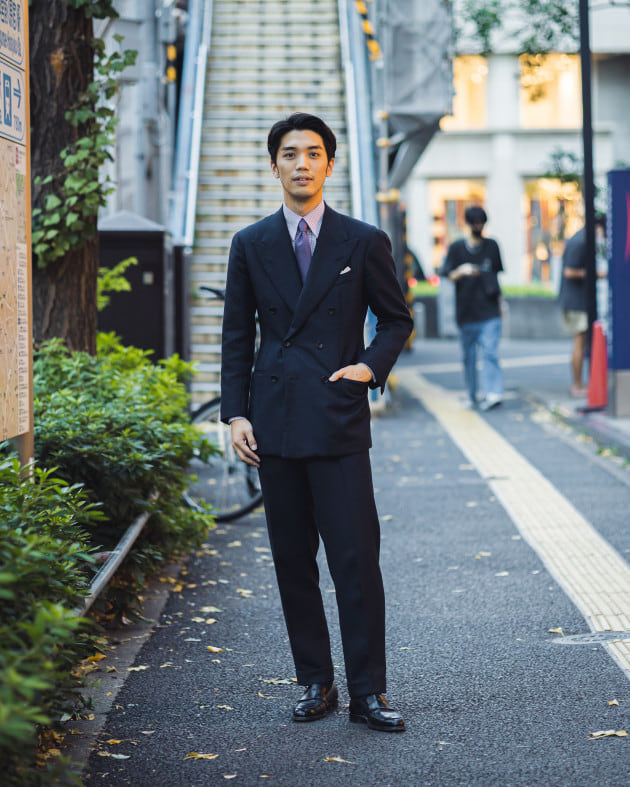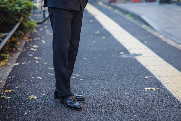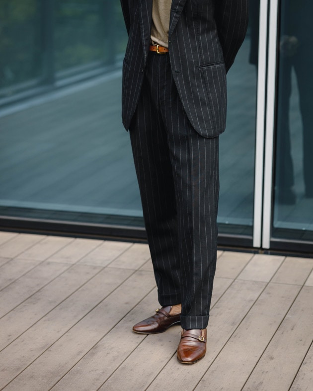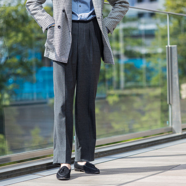 ネイビーブレザーと合わせて、いつものスタイルに柔らかなエッセンスを。グレーのワイドスラックスにブラックのダンスシューズで、リラックスかつモダンに仕上げました。都会っぽく映るように、光沢の強いキャバルリーツイルのチョイスもポイントです。