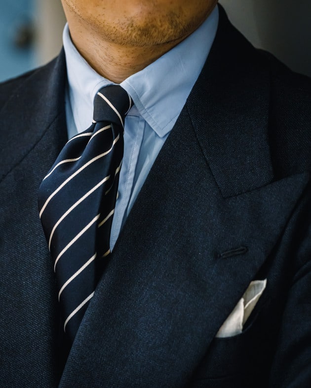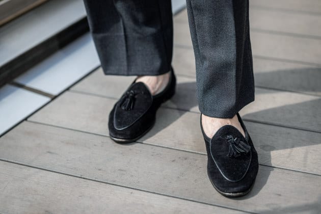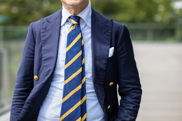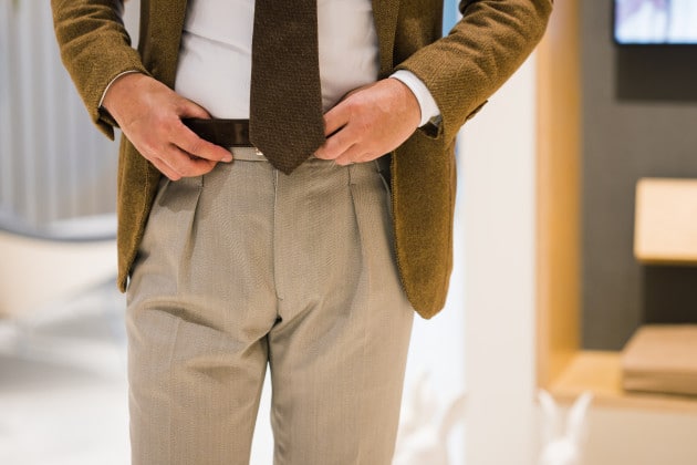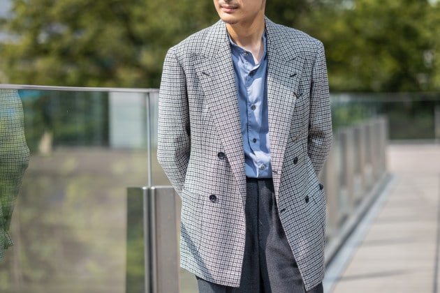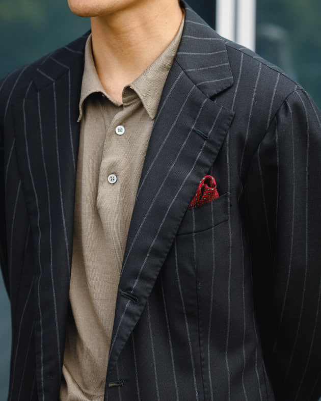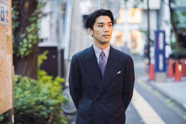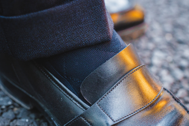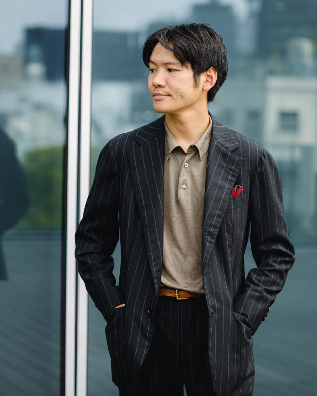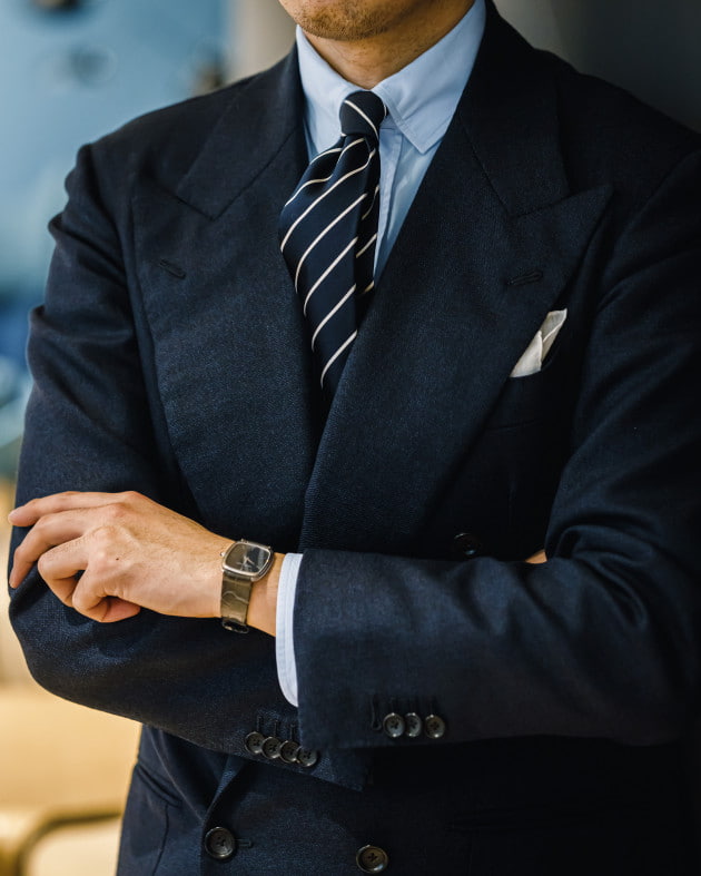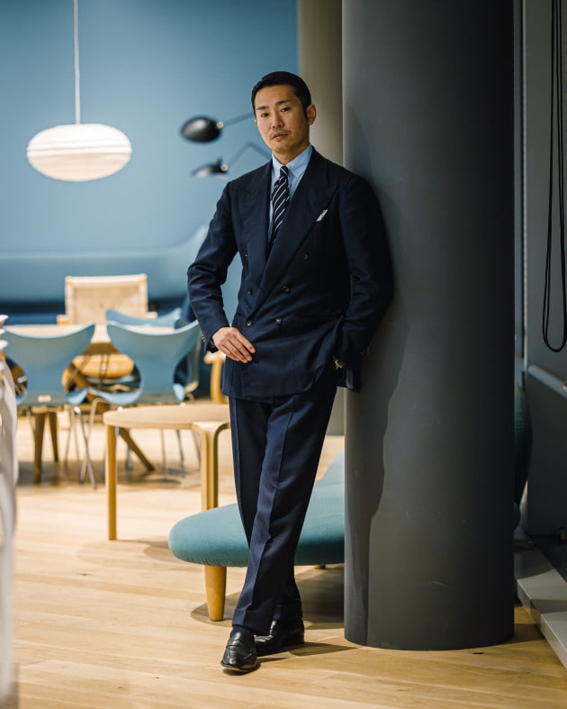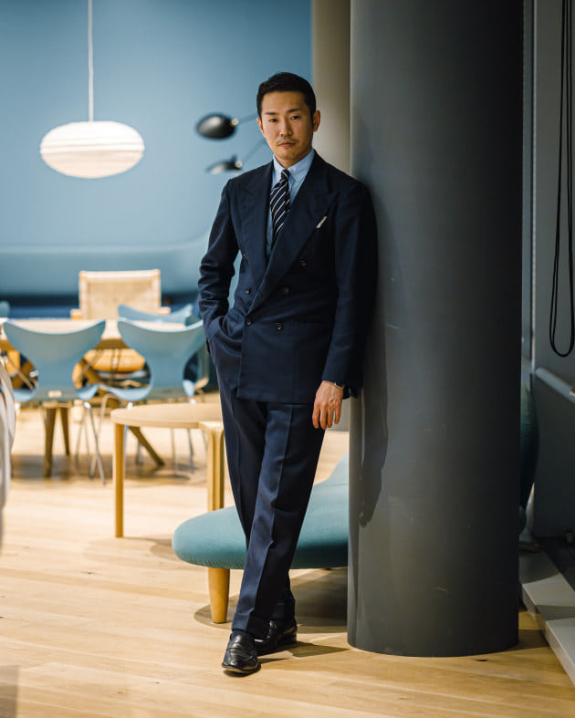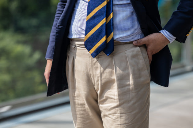 ネイビーブレザーと合わせて、いつものスタイルに柔らかなエッセンスを。グレーのワイドスラックスにブラックのダンスシューズで、リラックスかつモダンに仕上げました。都会っぽく映るように、光沢の強いキャバルリーツイルのチョイスもポイントです。