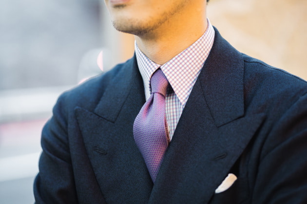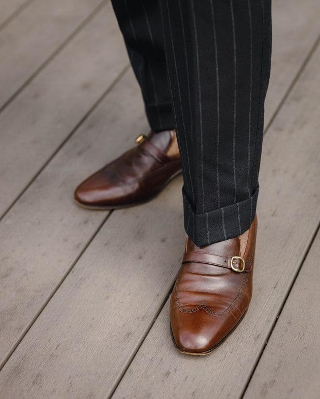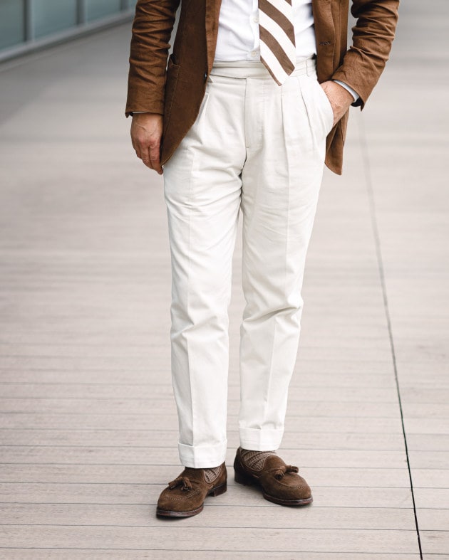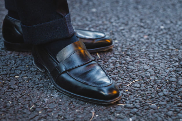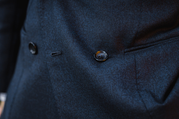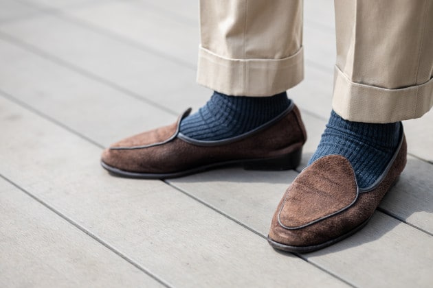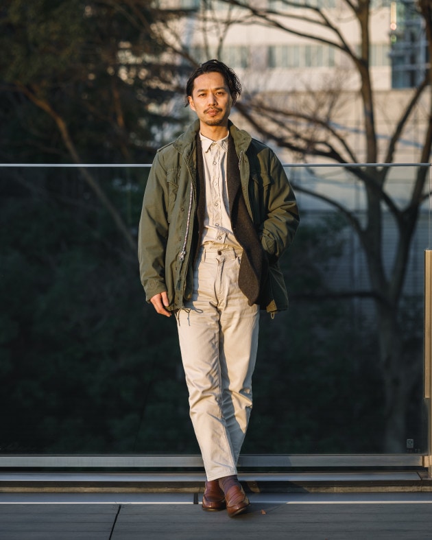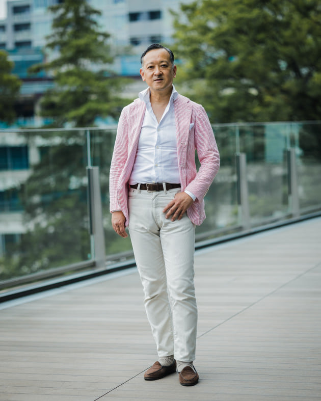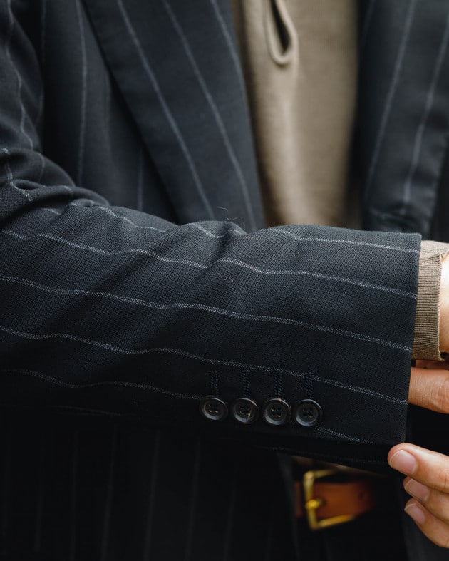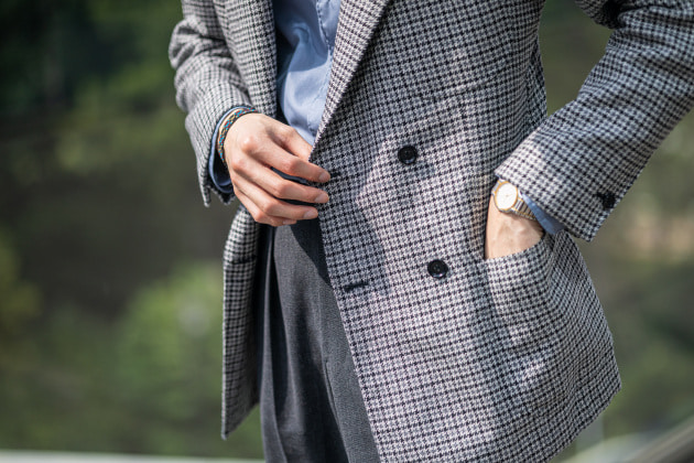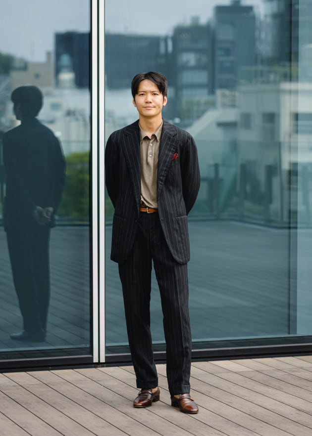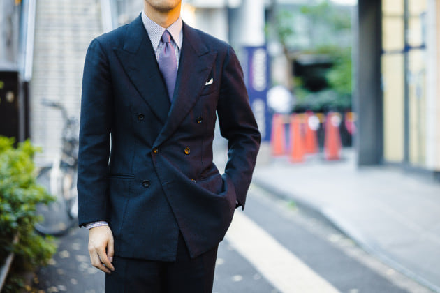 ネイビーブレザーと合わせて、いつものスタイルに柔らかなエッセンスを。グレーのワイドスラックスにブラックのダンスシューズで、リラックスかつモダンに仕上げました。都会っぽく映るように、光沢の強いキャバルリーツイルのチョイスもポイントです。