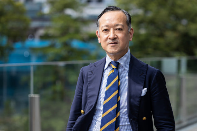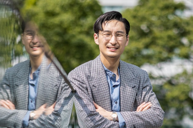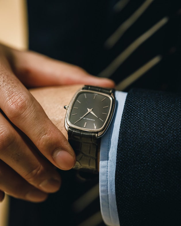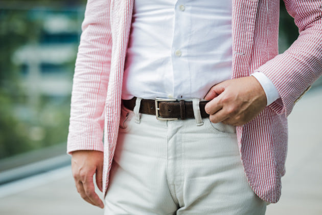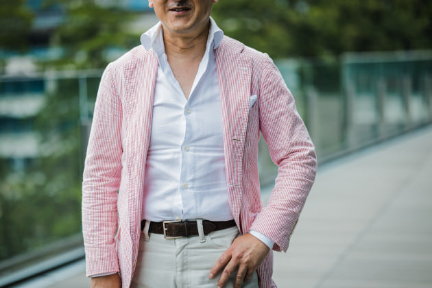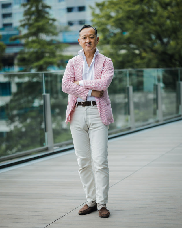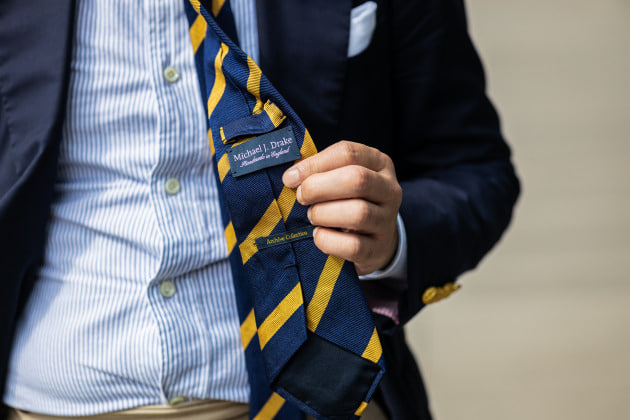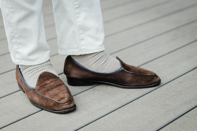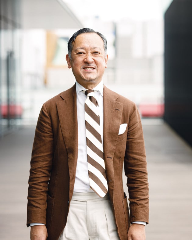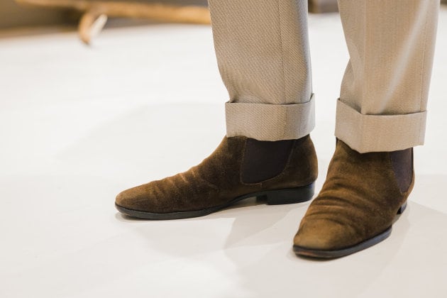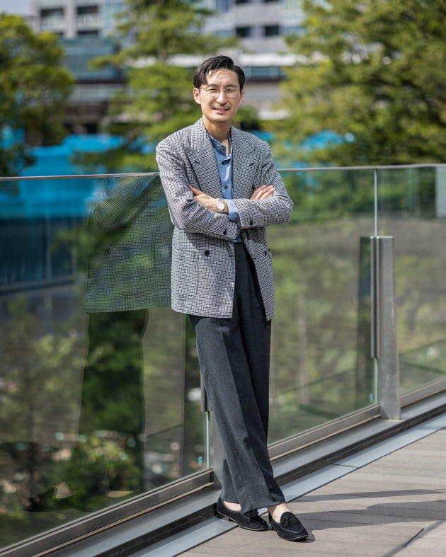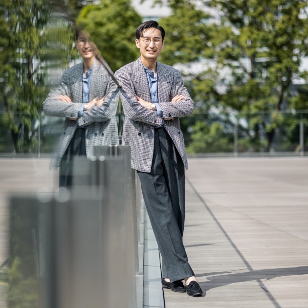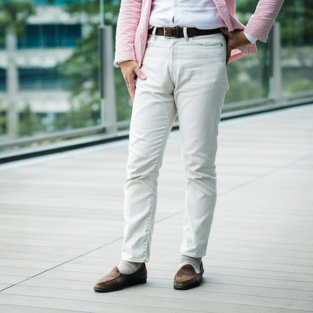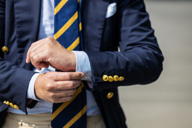 ネイビーブレザーと合わせて、いつものスタイルに柔らかなエッセンスを。グレーのワイドスラックスにブラックのダンスシューズで、リラックスかつモダンに仕上げました。都会っぽく映るように、光沢の強いキャバルリーツイルのチョイスもポイントです。