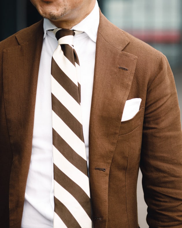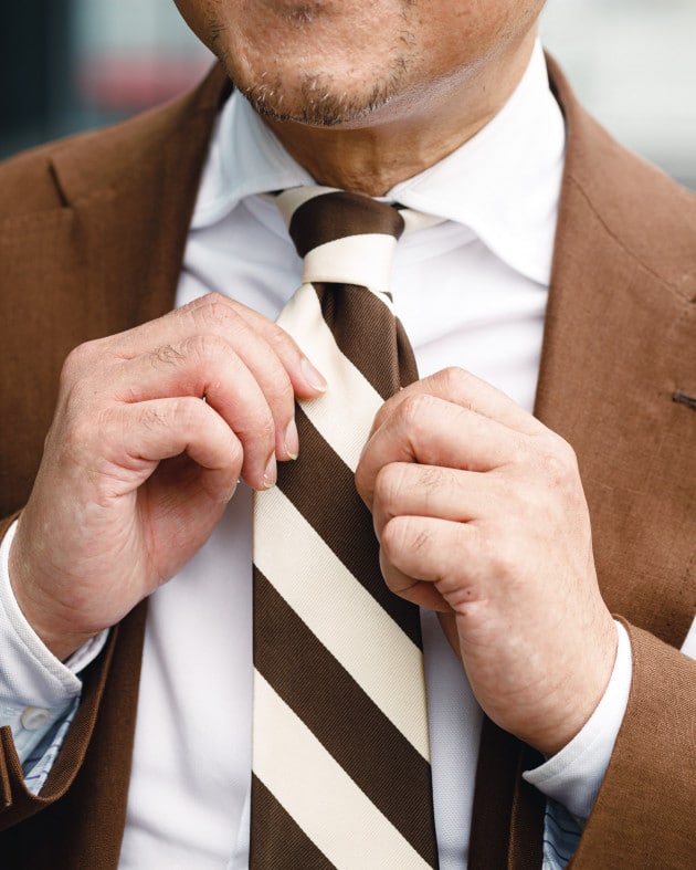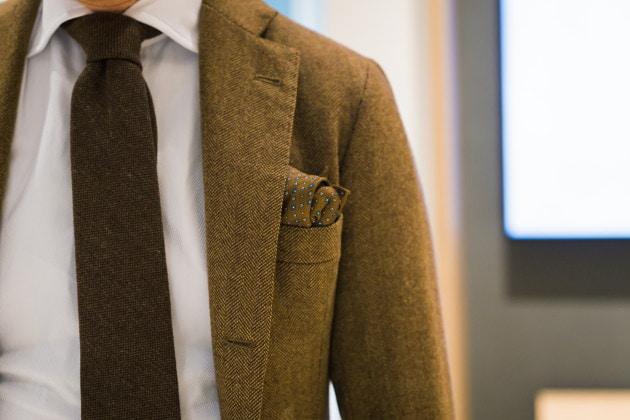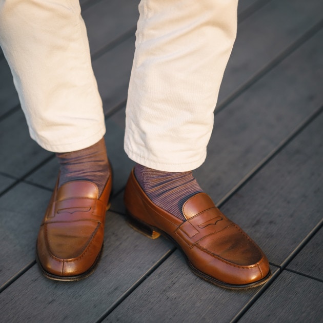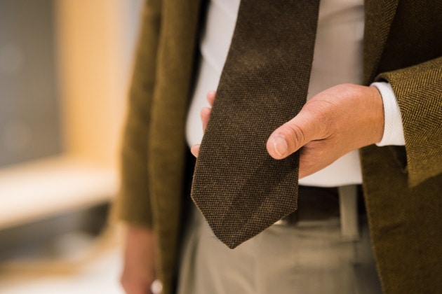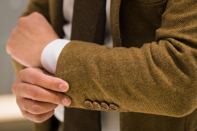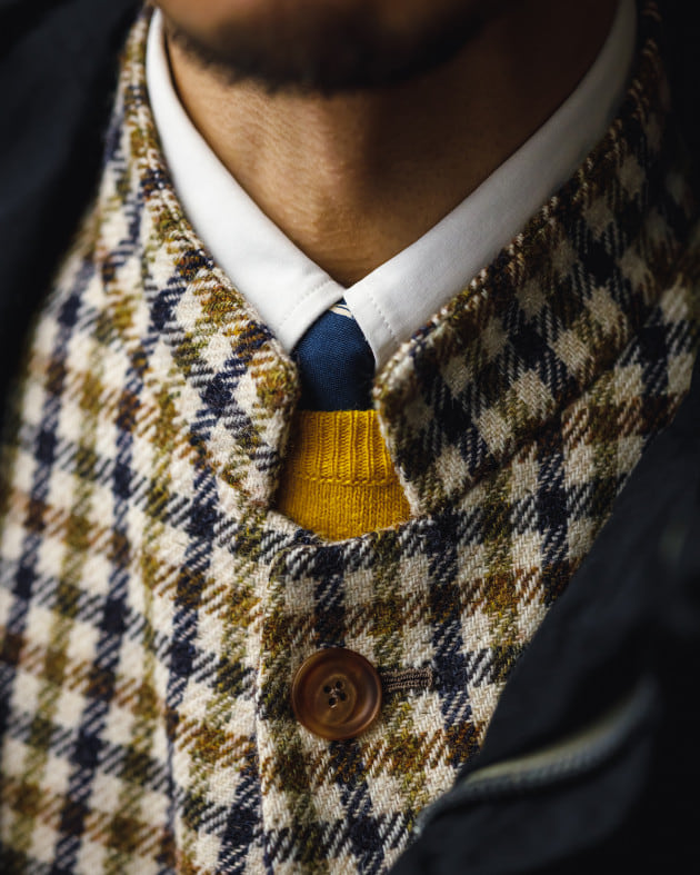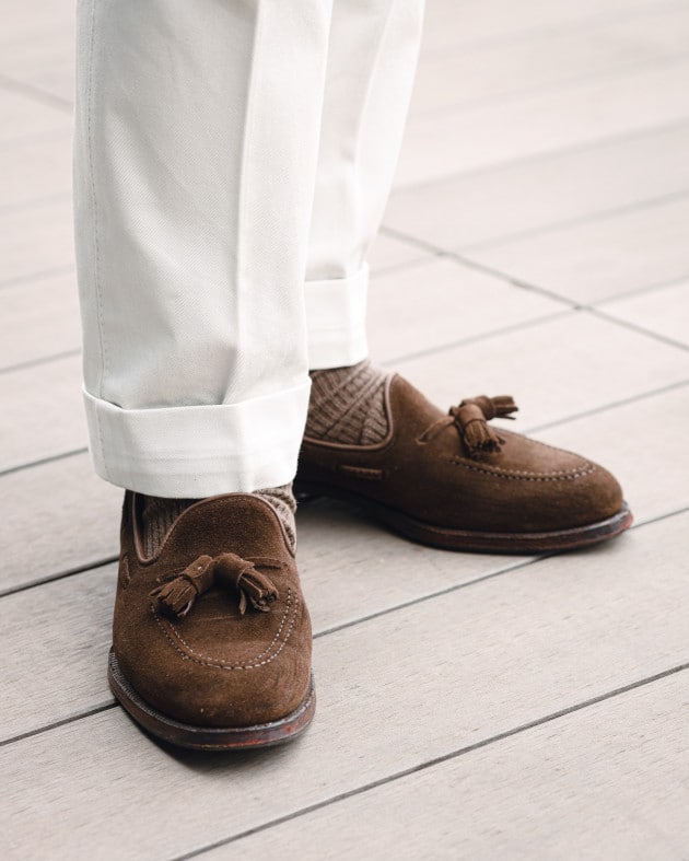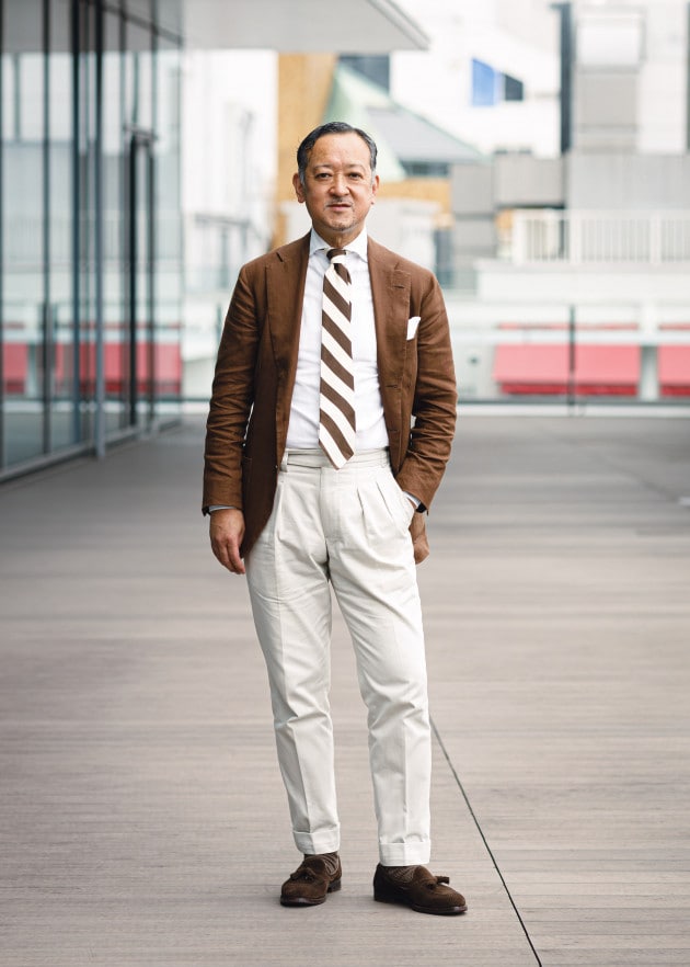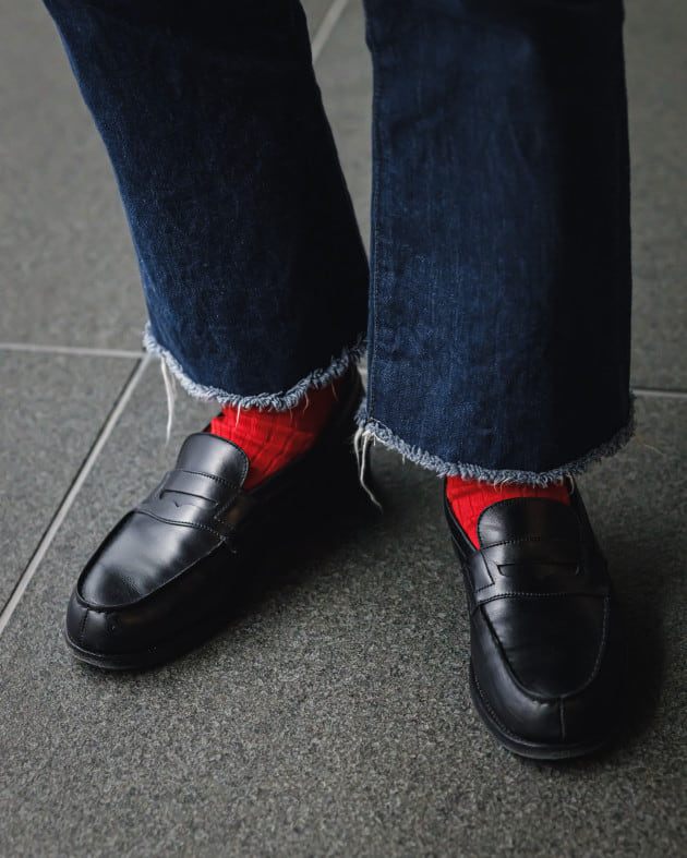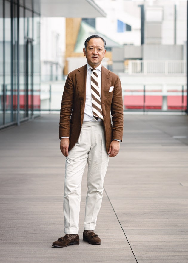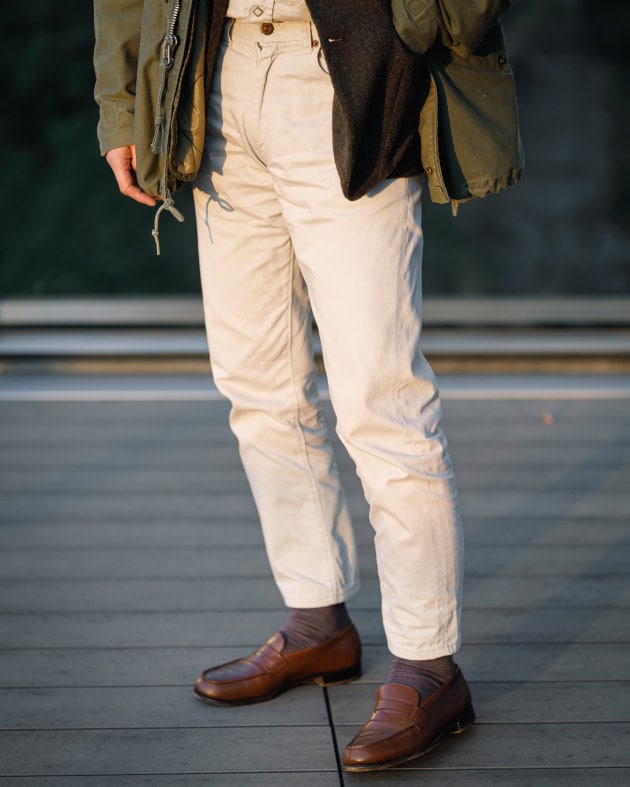 ブラウンのツイードジャケットと合わせてみました。ゴールドのニットに、リネン混のウールスラックス。そして華やかなビットローファー。野暮ったい色合わせですが、どこかエレガントなムードを感じる微妙な変化が気分です。