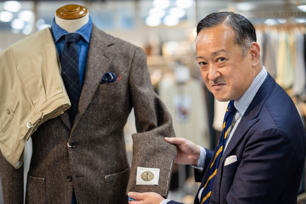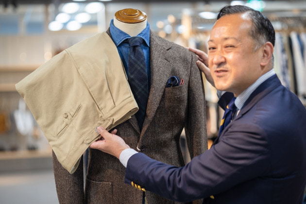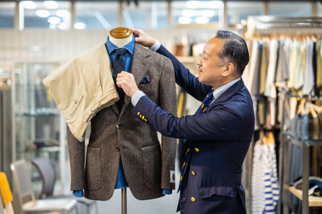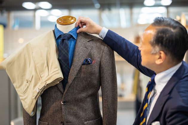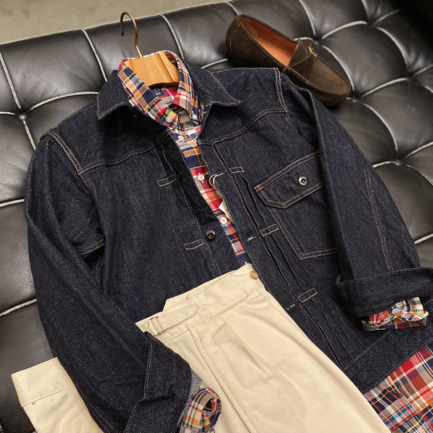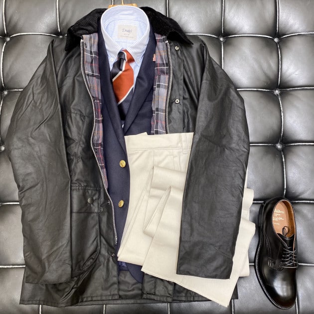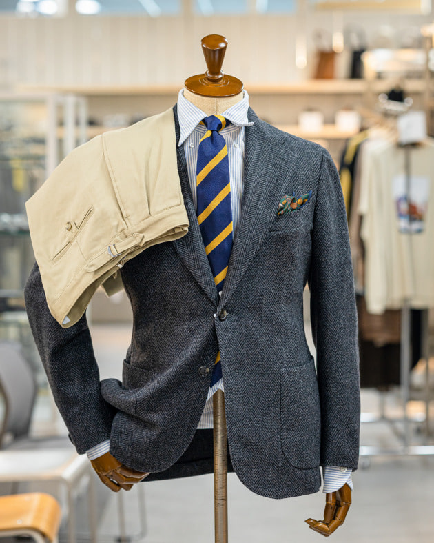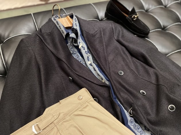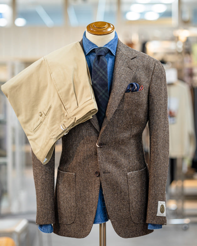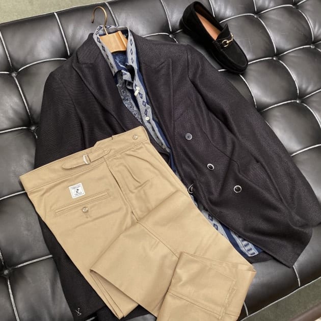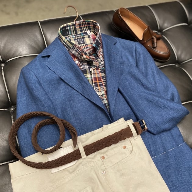 ブリティッシュアメリカンな空気感のブレザースタイル。タッタソールチェックにアメリカンなチノなど、ややカントリーなアイテムを合わせながらも、ブレザーはラグジュアリーなカシミヤ100%の色気ある仕立て。このバランス感がこなれた表情を作り出すポイントです。