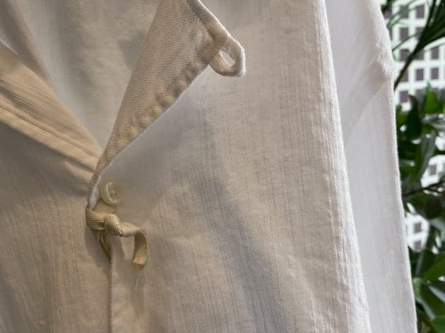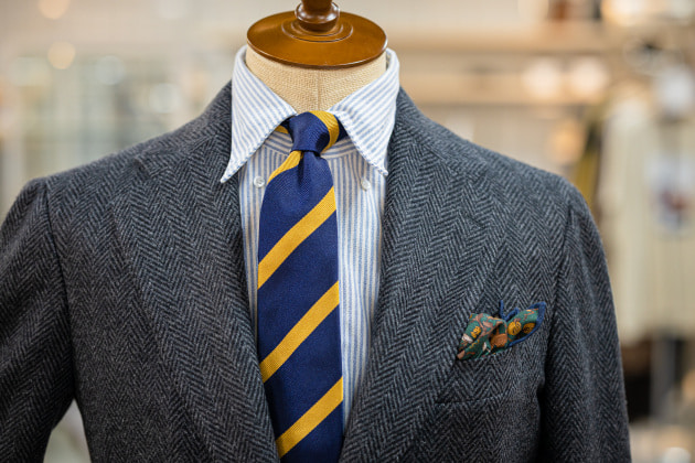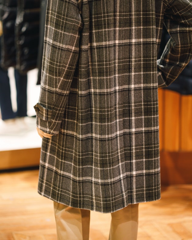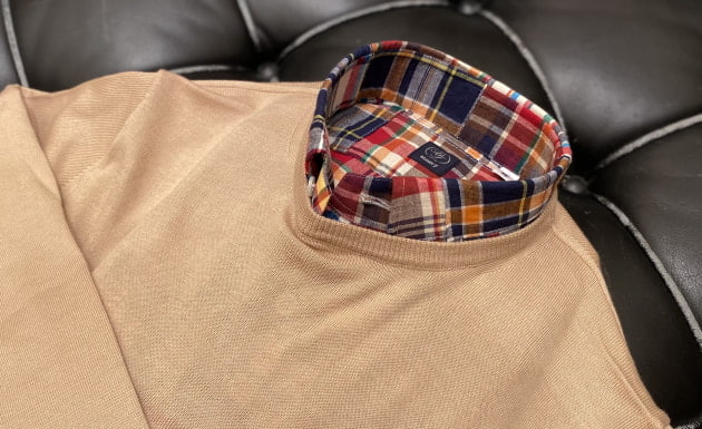 そんな上品さを活かしつつ、カントリーな空気感をVゾーンで取り入れます。タッタソールのチェックシャツにブラウンのニットタイ。