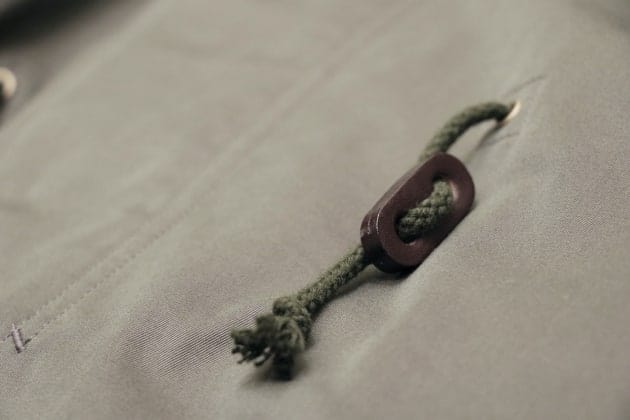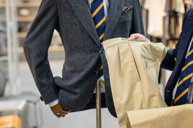 パンツはシンプル。アメリカンなベージュのコットンパンツでVゾーンとのつながりを意識して。