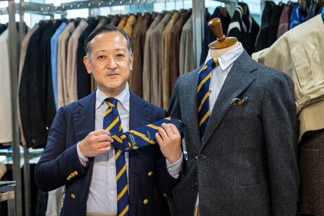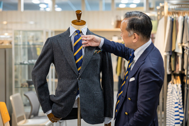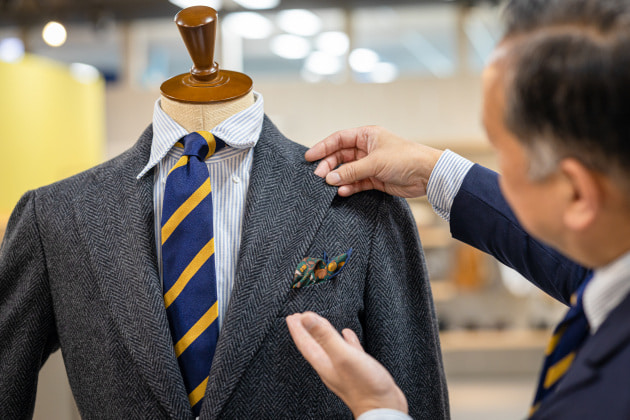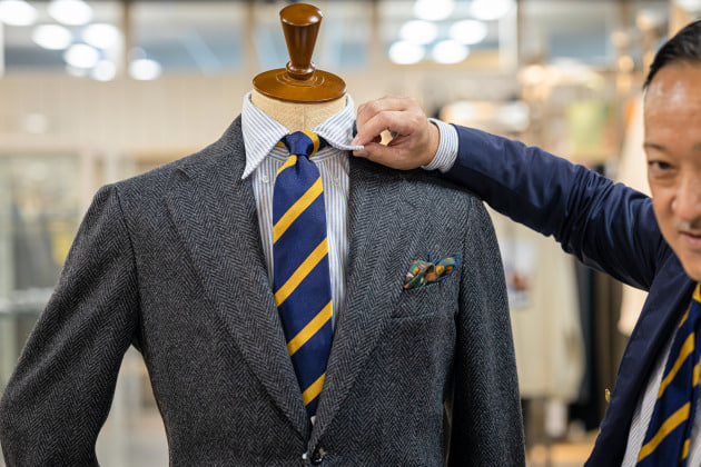 首元を彩るマルチなチェックがこなれた主張に。さりげなくタイの素材感をブレザーに寄せているところもポイント。