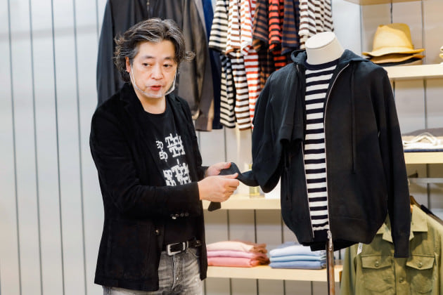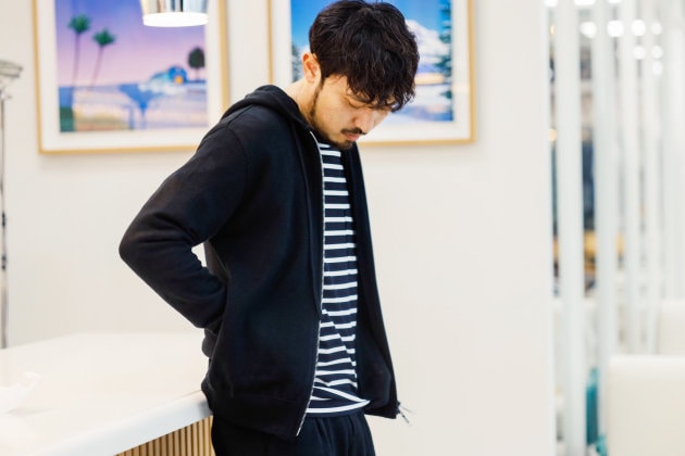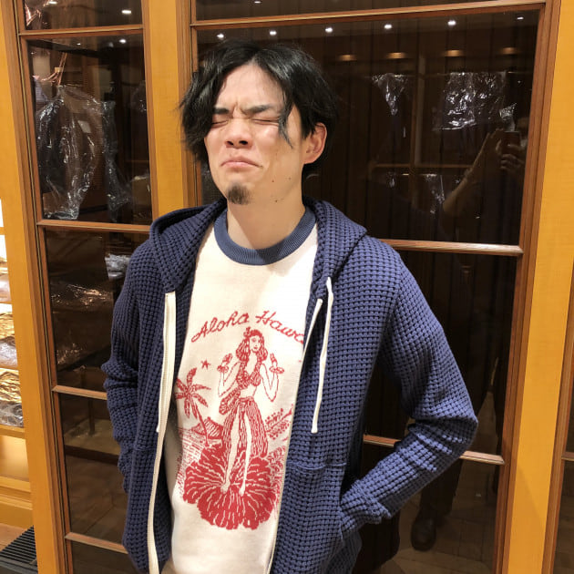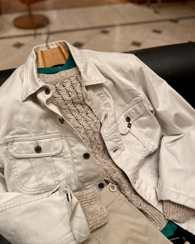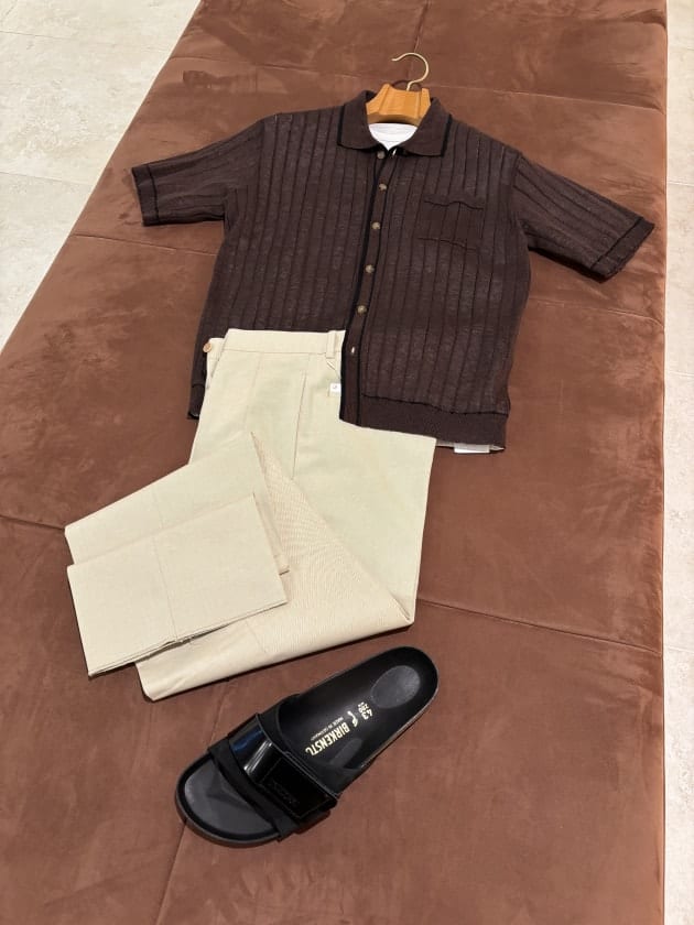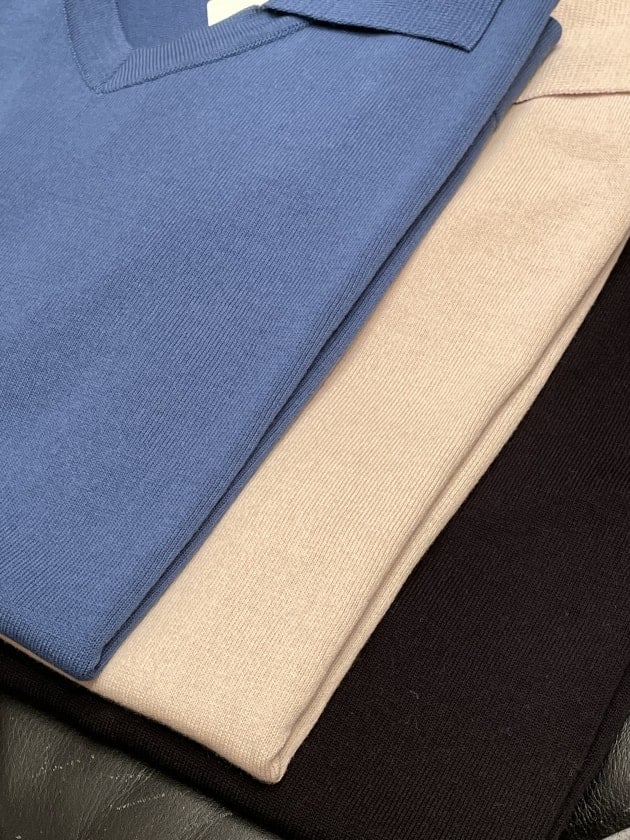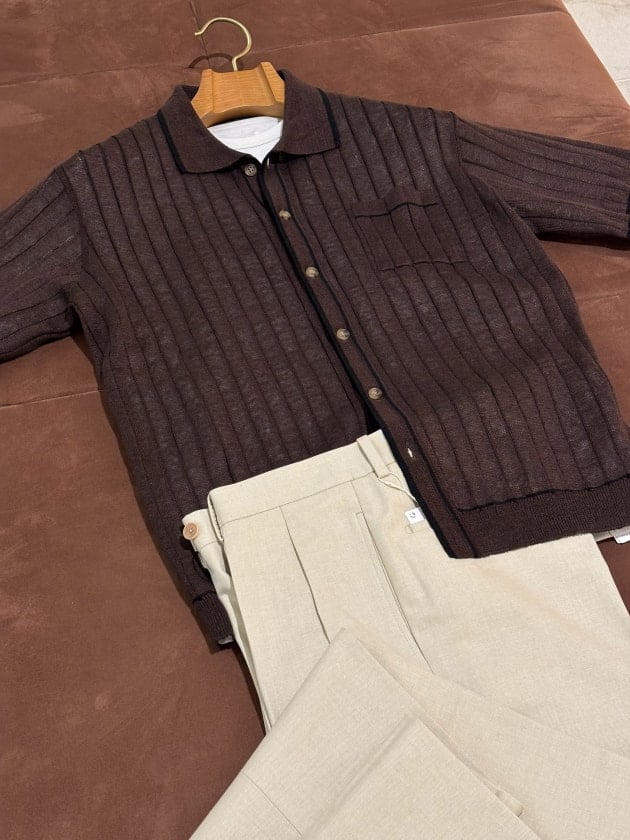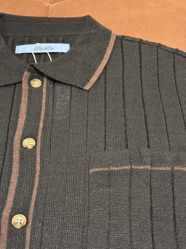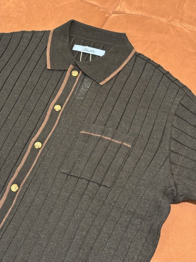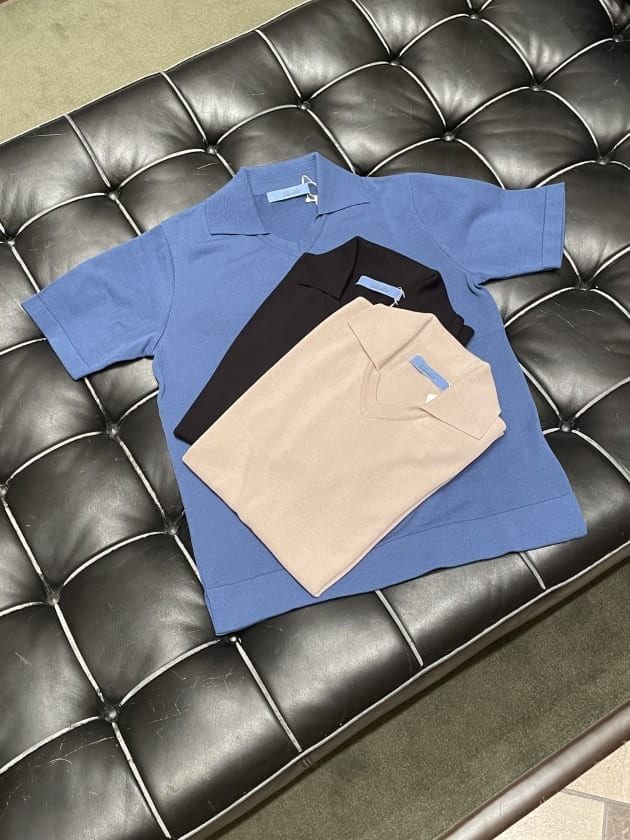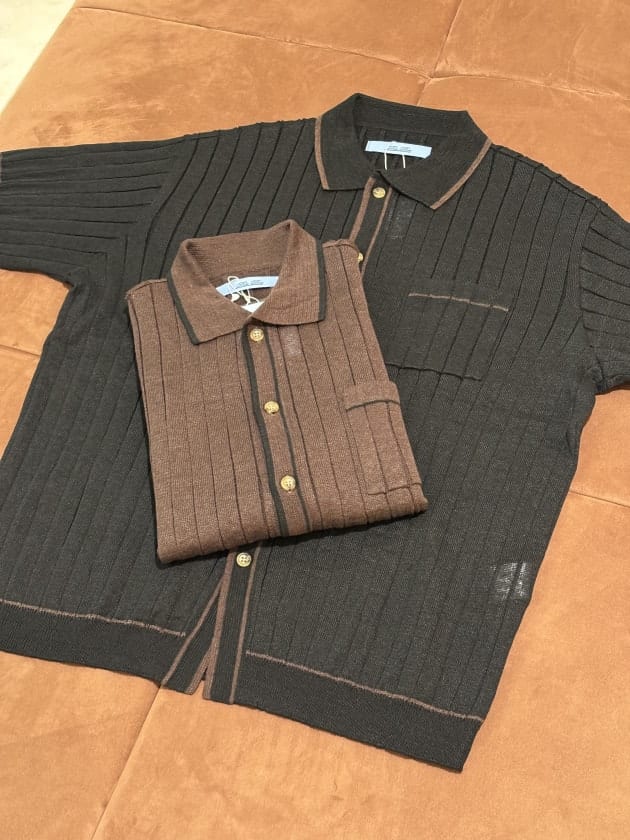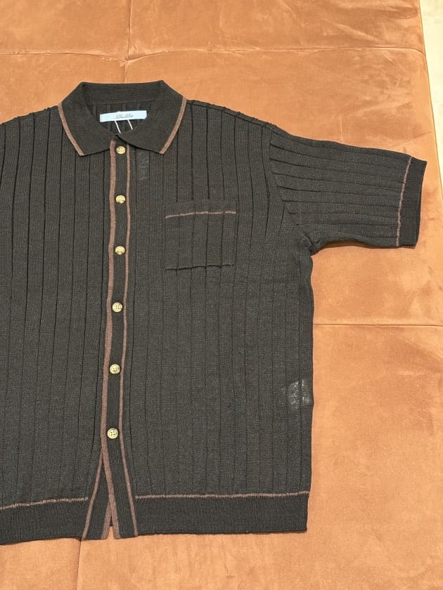 タックアウトで着用出来るニットシャツです。ポロシャツに近い雰囲気のアイテムですが、1枚で着用してもサマになる感じですね。