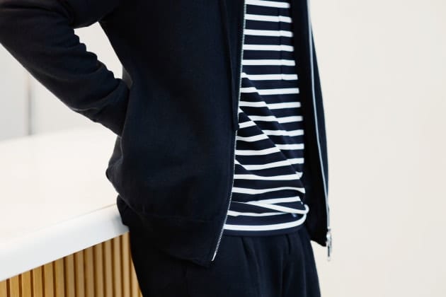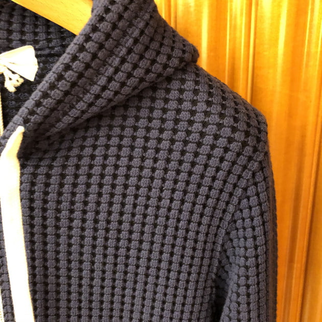 ボディにはストライプ状の編み地があって、所々バイカラーのトリムラインが入るデザイン。胸ポケットも付いています。