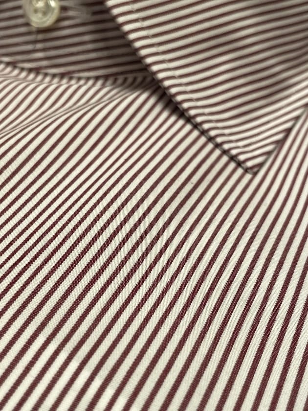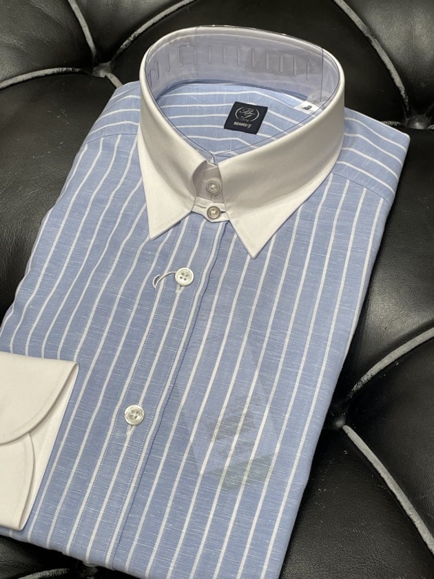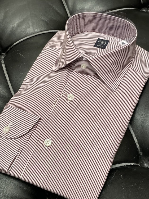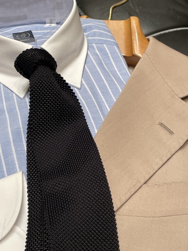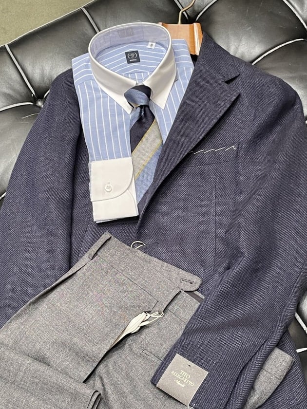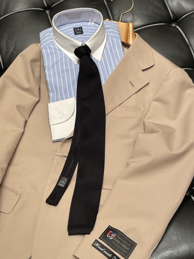 画像だとほとんど分からないのですが、シャツが淡いLILACカラーです。潔く白を使ってもいいのですが、ほんの少しマイルドに柔らかく見えますね。このシャツはなかなか使えると思います。