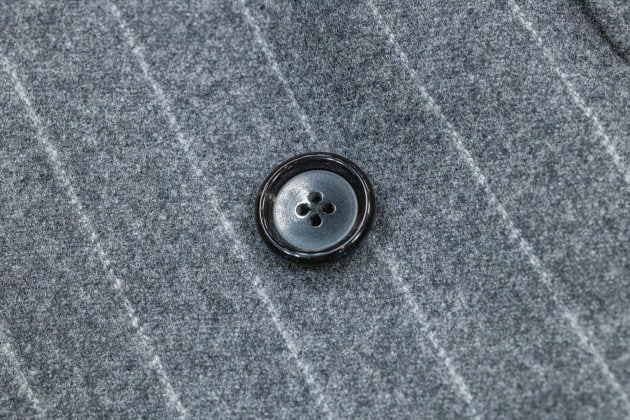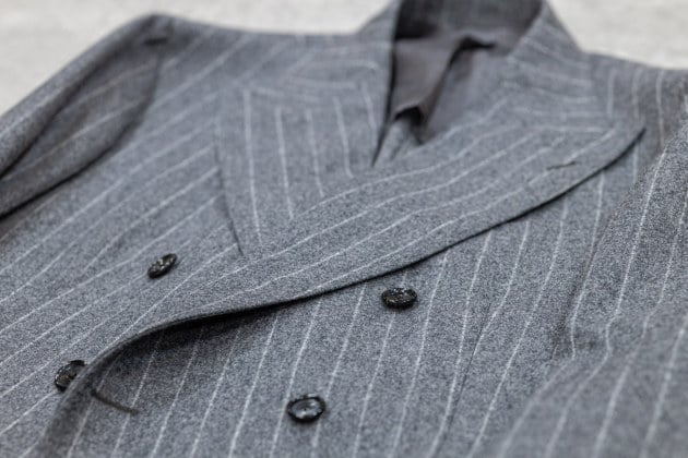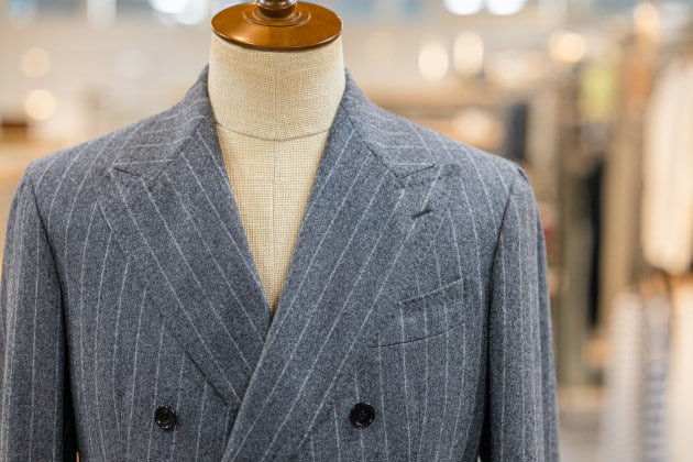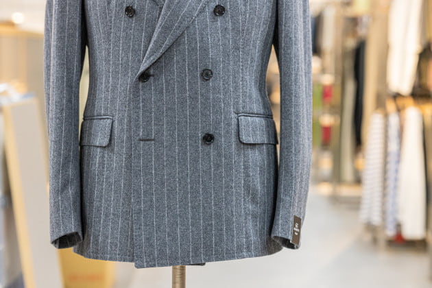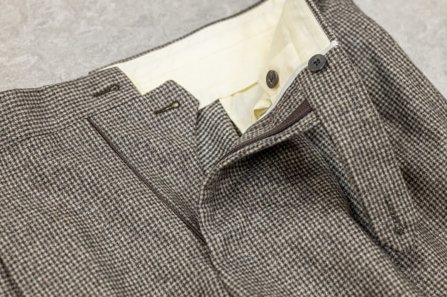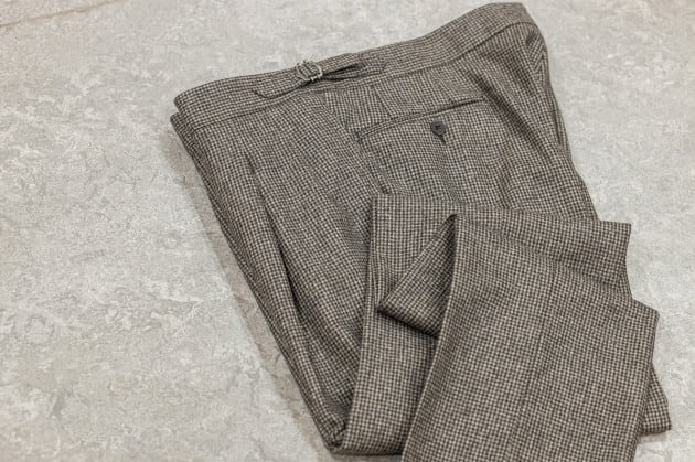 上品コーディネートなので、やはりパンツはウールがいいですね。ミディアムGREYのサキソニー。比較的軽めの生地感で細身のシルエット。クリーンに纏まると思います。
