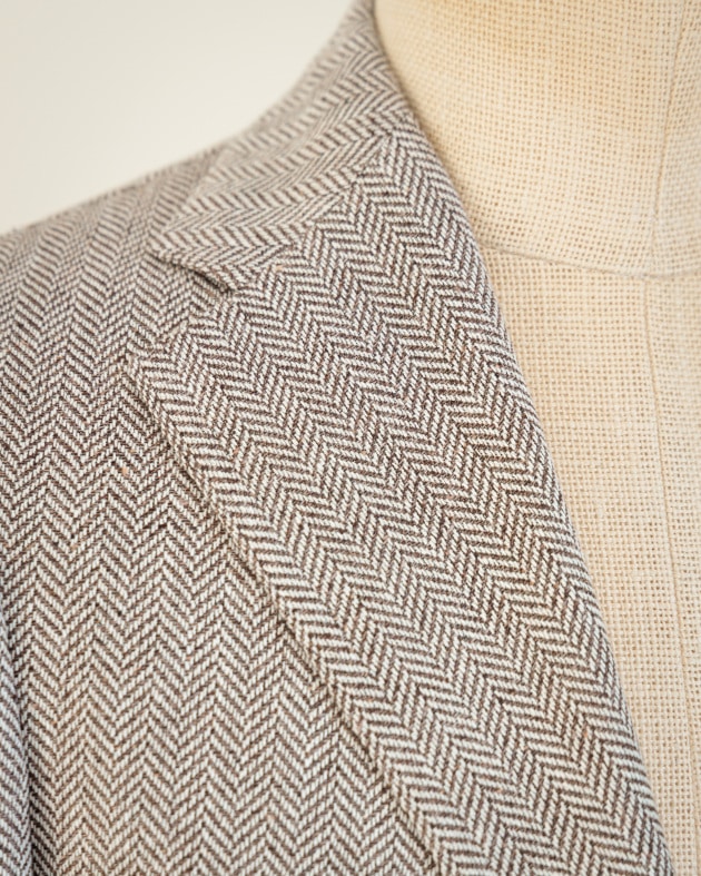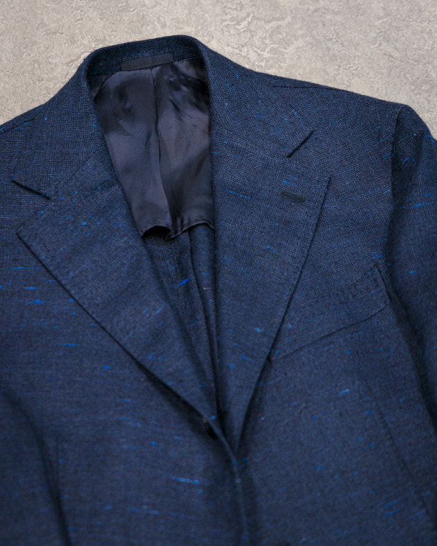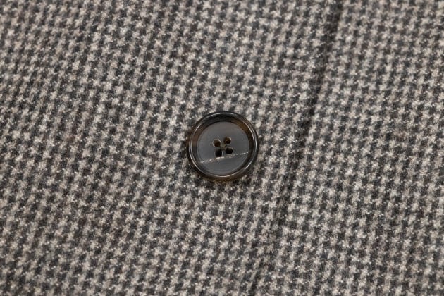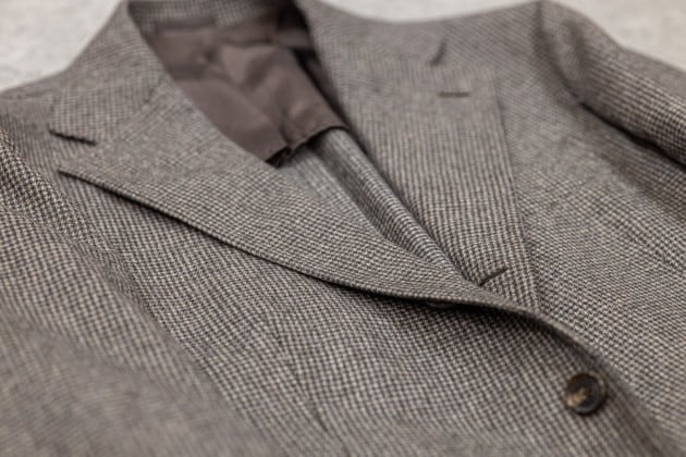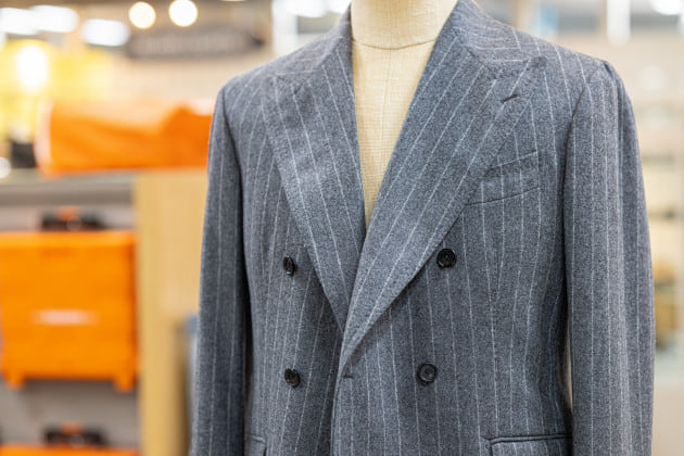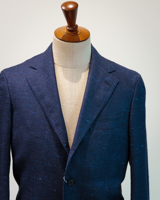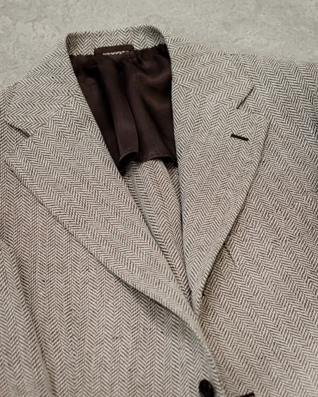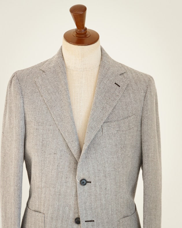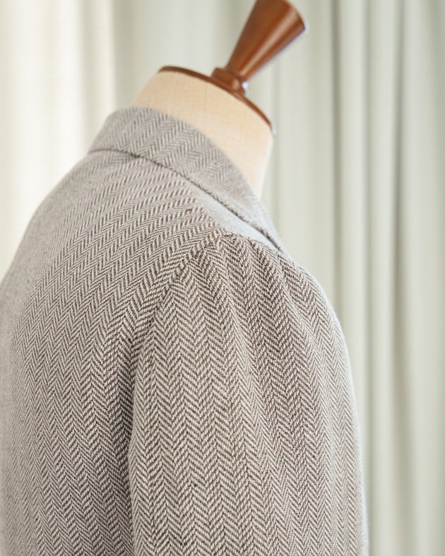 ネクタイは<Atto Vannucci>のウール素材セッテピエゲ。色柄としてはシンプル、ですがこのふっくらとした表情がポイントですね。存在感がありつつ、エレガントなVゾーンを演出してくれるネクタイです。